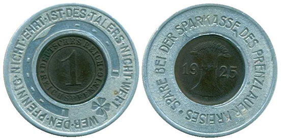 1 Pfennig 1925; nicht katalogisiert; Kupferpfennig eingefaßt in einen Aluminiumreifen: Vs. der Münze: oben von links: •DEUTSCHES REICH•; in der Mitte die Zahl"1"; unten von links: REICHSPFENNIG Rs. der Münze: in der Mitte eine Getreidegarbe, links "19" und rechts "25" Vs. des Aluminiumreifens: WER•DEN•PFENNIG•NICHT•EHRT •IST•DES•TALERS•NICHT•WERT Rs. des Aluminiumreifens: von links: SPARE BEI DER SPARKASSE DES PRENZLAUER KREISES•; Gewicht: 4,27g; Dm= 33,3mm |