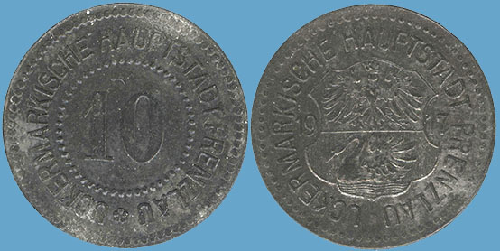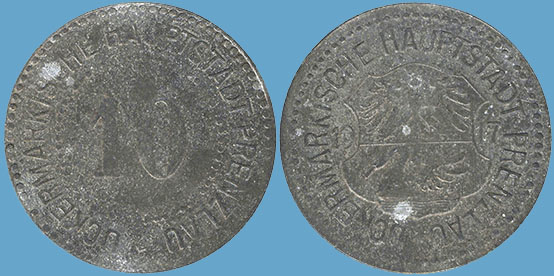 10 Pfennig 1917; Funck 431.2c; Menzel 26139.2; 1. Bedarfsgeld in Prenzlau; Zink; Dm = 23,0mm; Gewicht: 2,81 Gramm; Auflage 50.000 Stück; Vs. und Rs.: umlaufend: UCEKRMÄRKISCHE HAUPTSTADT PRENZLAU; Variante U - U 3,5mm; Prägefirma: L. Chr. Lauer, Nürnberg |