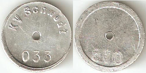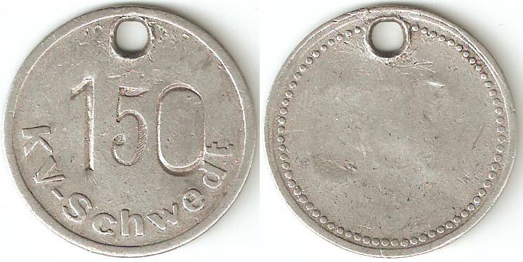 o. W.; o. J.; nicht katalogisiert; Vs.: umlaufend: KV-Schwedt oben 4mm gelocht mittig "150" geschlagen; Rs.: leer, mit Perlenkranz; Aluminium; Dm=30,0mm |