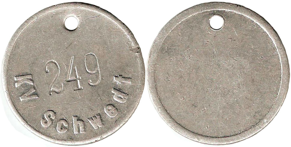 o. W.; o. J.; Menzel 36411; Vs.: umlaufend: KV Schwedt mittig 2mm gelocht unten Kontrollnummer geschlagen; Rs.: leer; Aluminium; Dm=20,3mm; Wäschemarke |
