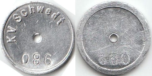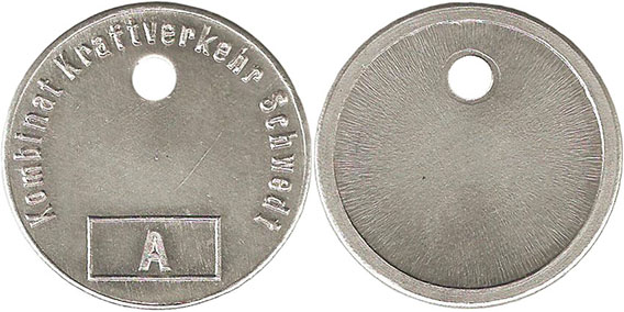 o. W.; o. J.; nicht katalogisiert; Vs.: umlaufend: Kombinat Kraftverkehr Schwedt oben 5mm gelocht unten in einem Rechteck geprägt "A" Rs.: leer; Aluminium; Dm=35,0mm |