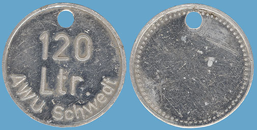 120 Ltr. o. J.; nicht katalogisiert; Vs.: AWU Schwedt, 120 Ltr.; Rs.: leer; oben 4mm gelocht; Aluminium; Dm=31,2mm; Gewicht: 2,84g |