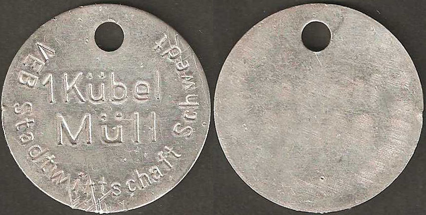 1 Kübel Müll o. J.; Menzel 12304.2; "1 Kübel Müll" (vertieft); Rs.: oben "S" vertieft; Al; Dm=35,0mm; oben 5mm gelocht |