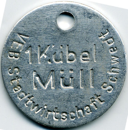 1 Kübel Müll o. J.; Menzel 12304.1; "1 Kübel Müll" (vertieft); Rs.: leer; Al; Dm=35,0mm; oben 5mm gelocht |