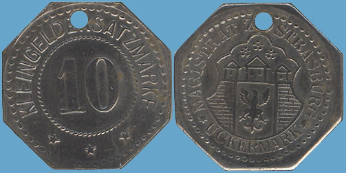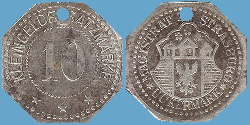 10 Pfennig o. J.; Funck 524.4Ab; Vs.: Wappen; Rs.: Wertziffer und umlaufend: KLEINGELDERSATZMARKE; Eisen; Dm=20,8mm; oben 2mm lochentwertet; Anstrich 1 ist dick, schräg abgeschnitten |
