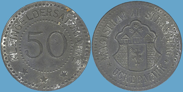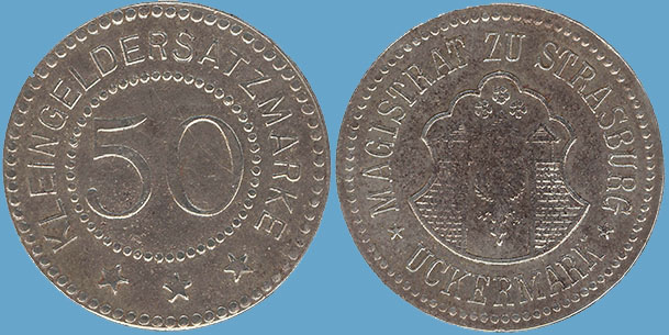 50 Pfennig o. J.; Menzel 3433.2; Vs.: Wappen; Rs.: Wertziffer und umlaufend: KLEINGELDERSATZMARKE; Zink; Dm=25,5mm; Gewicht: 4,01 Gramm |