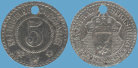 5 Pfennig o. J.; Menzel 3433.3; Vs.: Wappen; Rs.: Wertziffer und umlaufend: KLEINGELDERSATZMARKE; Eisen; Dm=19,1mm; Gewicht: 2,06 Gramm; oben 2mm lochentwertet |