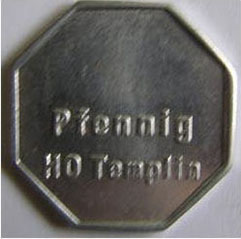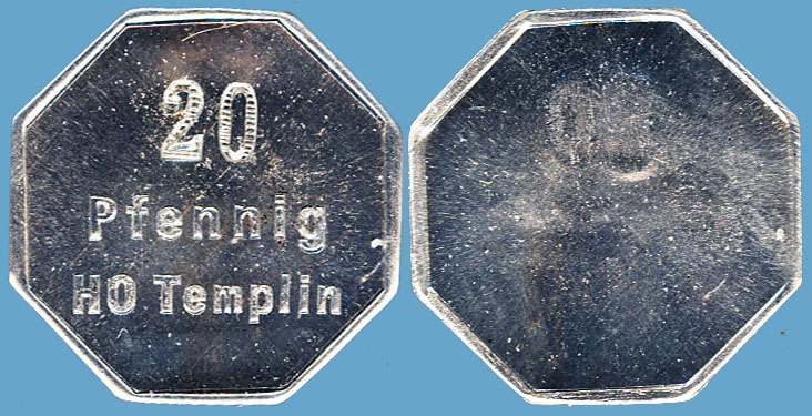 20 Pfennig o. J.; Menzel 13208.4; Vs.: erhaben geprägter Rand; "20" eingeschlagen; "Pfennig" und darunter "HO Templin" erhaben geprägt; Rs.: leer; Aluminium; Gewicht: 2,31 Gramm; 30,2mm 8eckig |