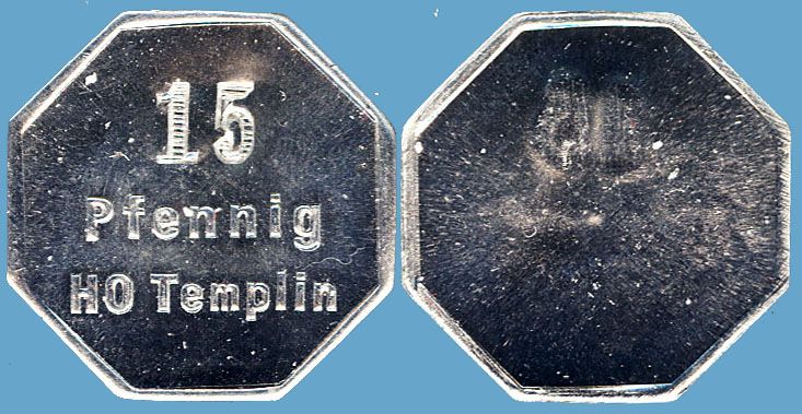 15 Pfennig o. J.; Menzel 13208.3; Vs.: erhaben geprägter Rand; "15" eingeschlagen; "Pfennig" und darunter "HO Templin" erhaben geprägt; Rs.: leer; Aluminium; 30,2mm 8eckig |