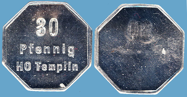 30 Pfennig o. J.; Menzel 13208.5; Vs.: erhaben geprägter Rand; "30" eingeschlagen; "Pfennig" und darunter "HO Templin" erhaben geprägt; Rs.: leer; Aluminium; 30,2mm 8eckig |