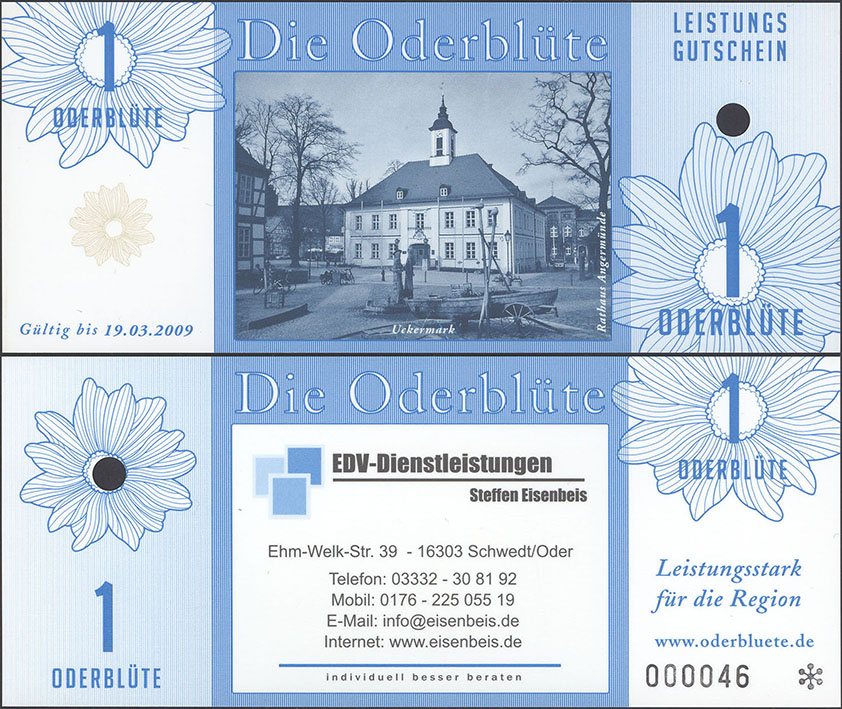 1 Oderblüte; erschienen 2007; nicht katalogisiert; Vs.: Rathaus Angermünde, gültig bis19.3.2009; Rs.: WZ. 6-stellig und dahinter ein 6-zackiger Stern; ohne Wz.; Hellblau; lochentwertet; gedruckt auf Robuskin PE; Druckerei: Wippold, Schwedt |