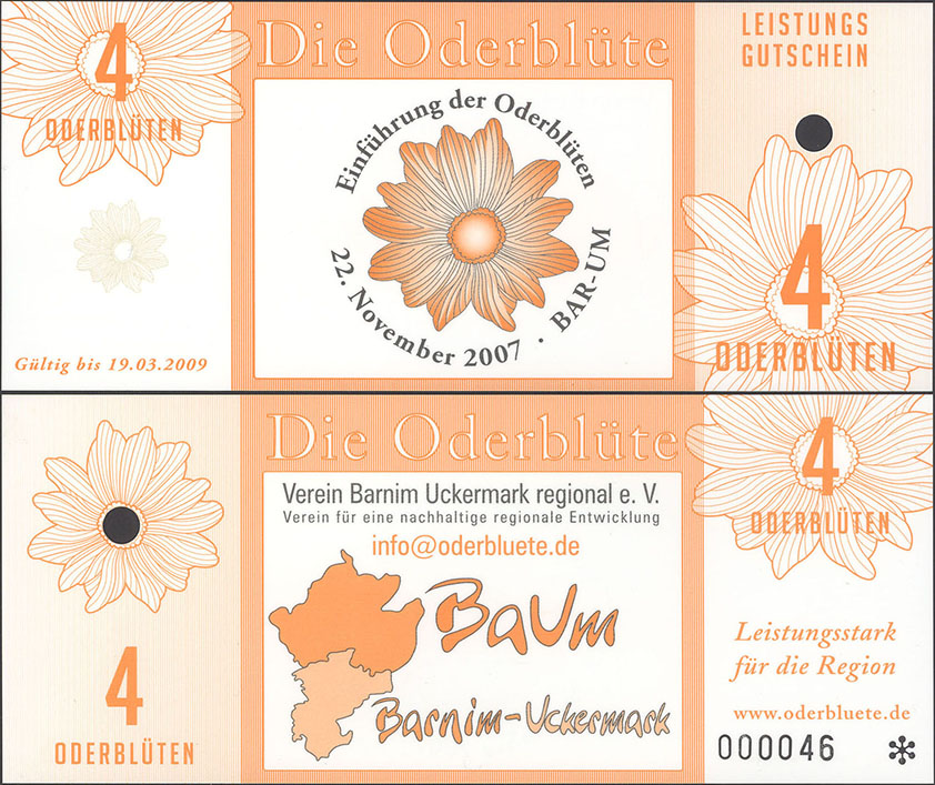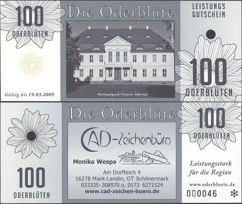 100 Oderblüten; erschienen 2007; nicht katalogisiert; Vs.: Schloss Criewen, gültig bis19.3.2009; Rs.: WZ. 6-stellig und dahinter ein 6-zackiger Stern; ohne Wz.; Graublau; lochentwertet; gedruckt auf Robuskin PE; Druckerei: Wippold, Schwedt |