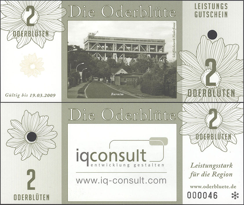 2 Oderblüten; erschienen 2007; nicht katalogisiert; Vs.: Schiffshebewerk Finow, gültig bis19.3.2009; Rs.: WZ. 6-stellig und dahinter ein 6-zackiger Stern; ohne Wz.; Khakigrün; lochentwertet; gedruckt auf Robuskin PE; Druckerei: Wippold, Schwedt |