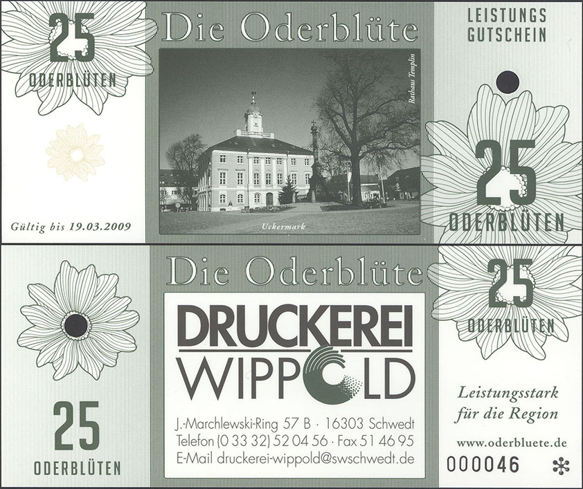 25 Oderblüten; erschienen 2007; nicht katalogisiert; Vs.: Rathaus Templin, gültig bis19.3.2009; Rs.: WZ. 6-stellig und dahinter ein 6-zackiger Stern; ohne Wz.; Olivgrün; lochentwertet; gedruckt auf Robuskin PE; Druckerei: Wippold, Schwedt |