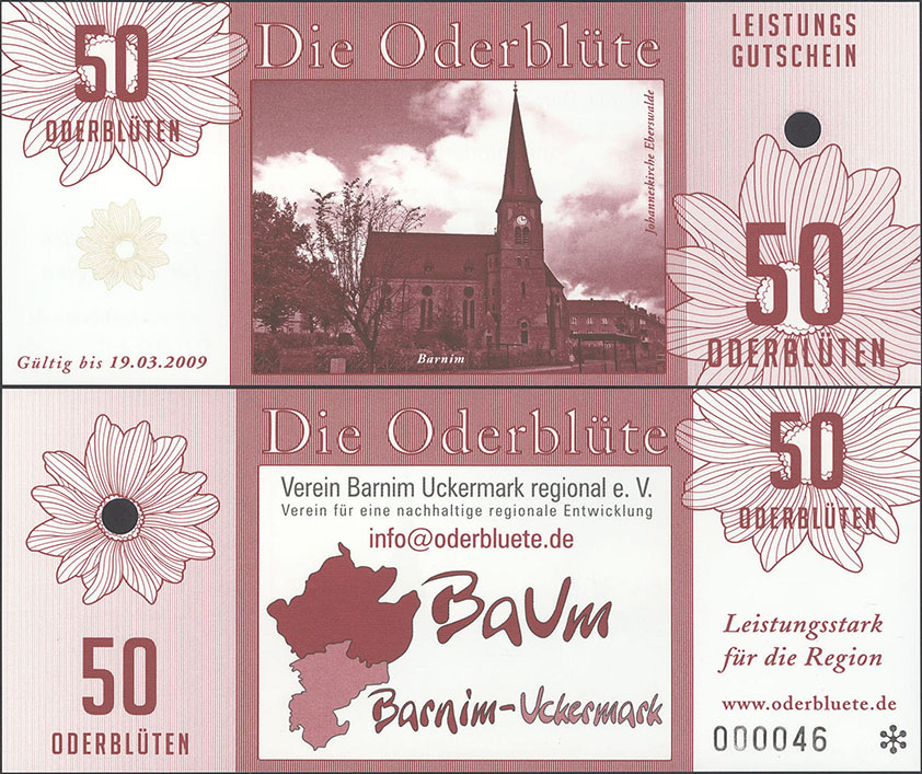 50 Oderblüten; erschienen 2007; nicht katalogisiert; Vs.: Johanniskirche Eberswalde, gültig bis19.3.2009; Rs.: WZ. 6-stellig und dahinter ein 6-zackiger Stern; ohne Wz.; Rotbraun; lochentwertet; gedruckt auf Robuskin PE; Druckerei: Wippold, Schwedt |