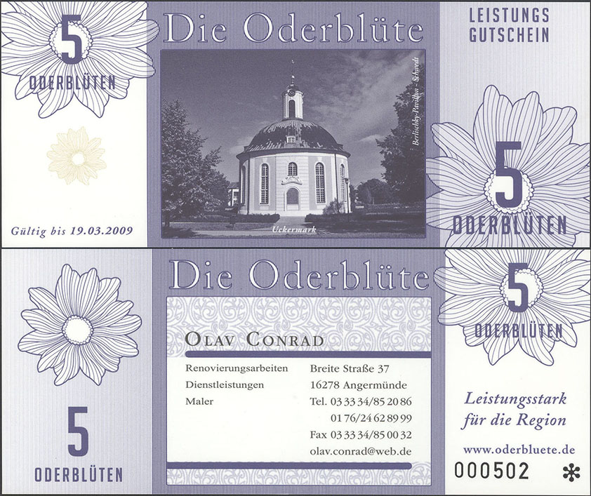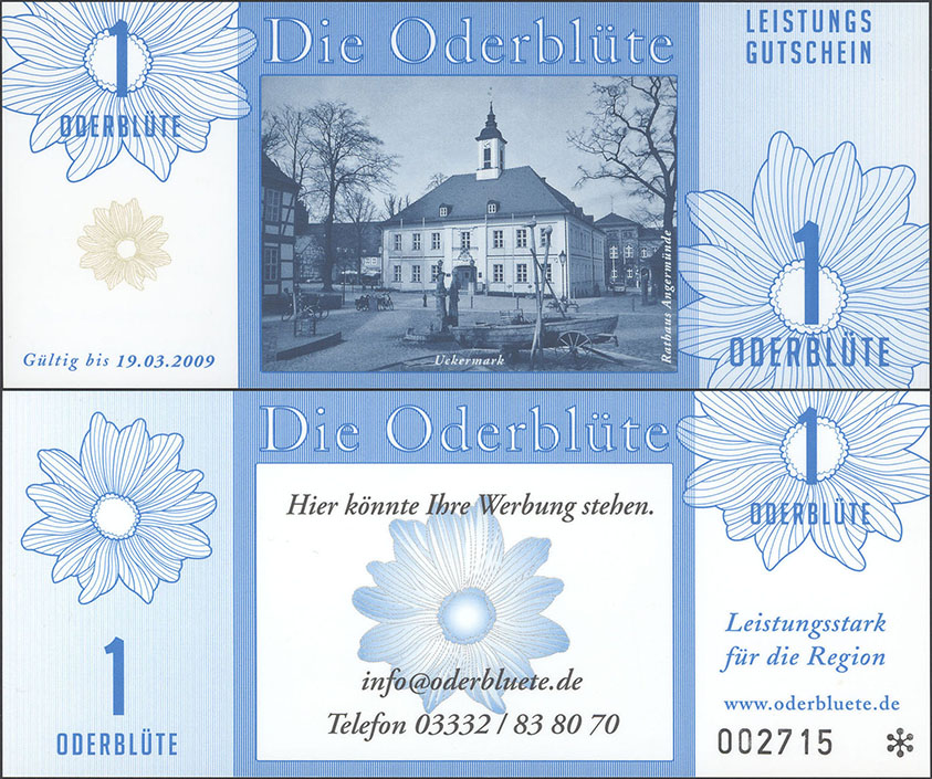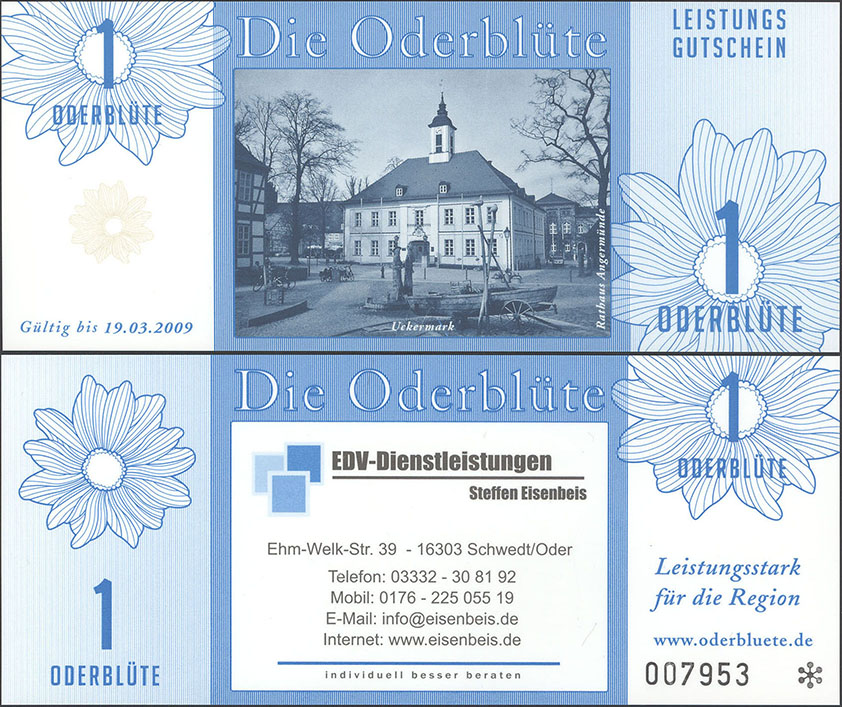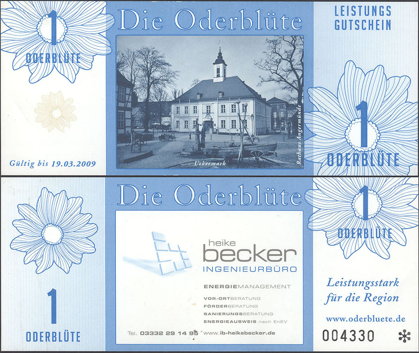 1 Oderblüte; erschienen 2008; Lange OD01.1; Vs.: Rathaus Angermünde, gültig bis19.3.2009; Rs.: WZ. 6-stellig und dahinter ein 6-zackiger Stern; ohne Wz.; Hellblau; gedruckt auf Robuskin PE; Druckerei: Wippold, Schwedt |