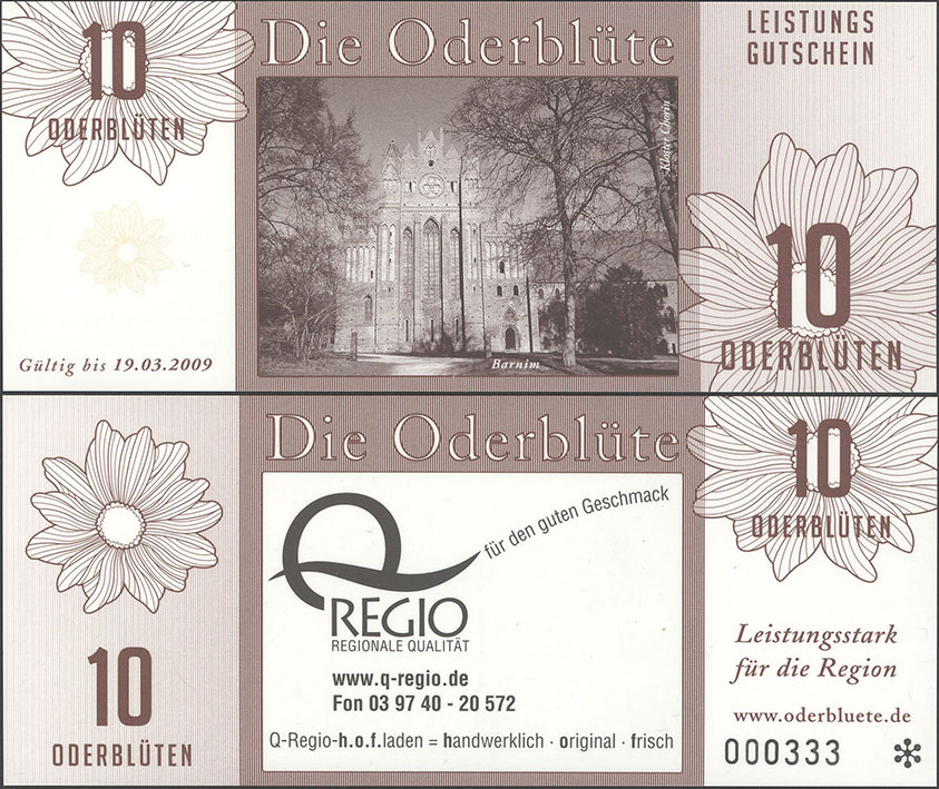 10 Oderblüten; erschienen 2008; Lange OD01.5; Vs.: Kloster Chorin, gültig bis19.3.2009; Rs.: WZ. 6-stellig und dahinter ein 6-zackiger Stern; ohne Wz.; Braun; gedruckt auf Robuskin PE; Druckerei: Wippold, Schwedt |