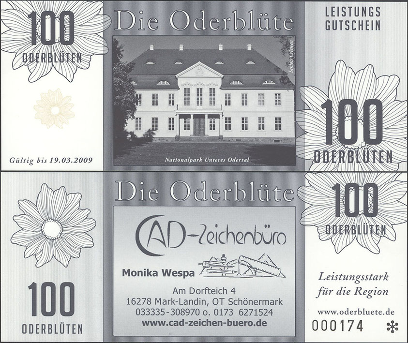 100 Oderblüten; erschienen 2008; Lange OD01.8; Vs.: Schloss Criewen, gültig bis19.3.2009; Rs.: WZ. 6-stellig und dahinter ein 6-zackiger Stern; ohne Wz.; Graublau; gedruckt auf Robuskin PE; Druckerei: Wippold, Schwedt |