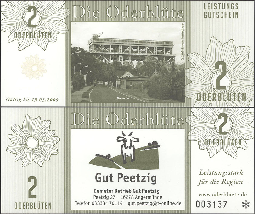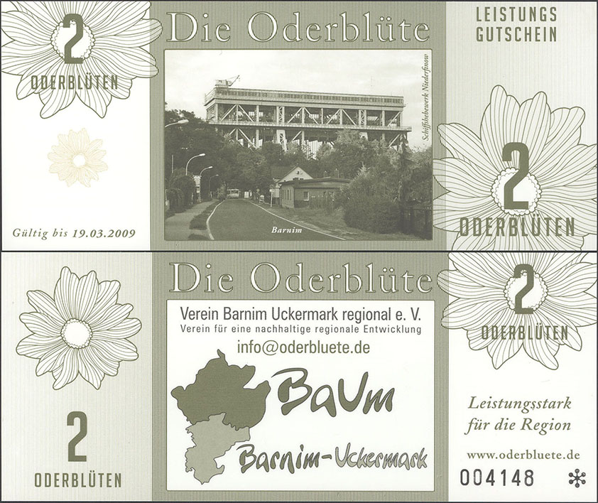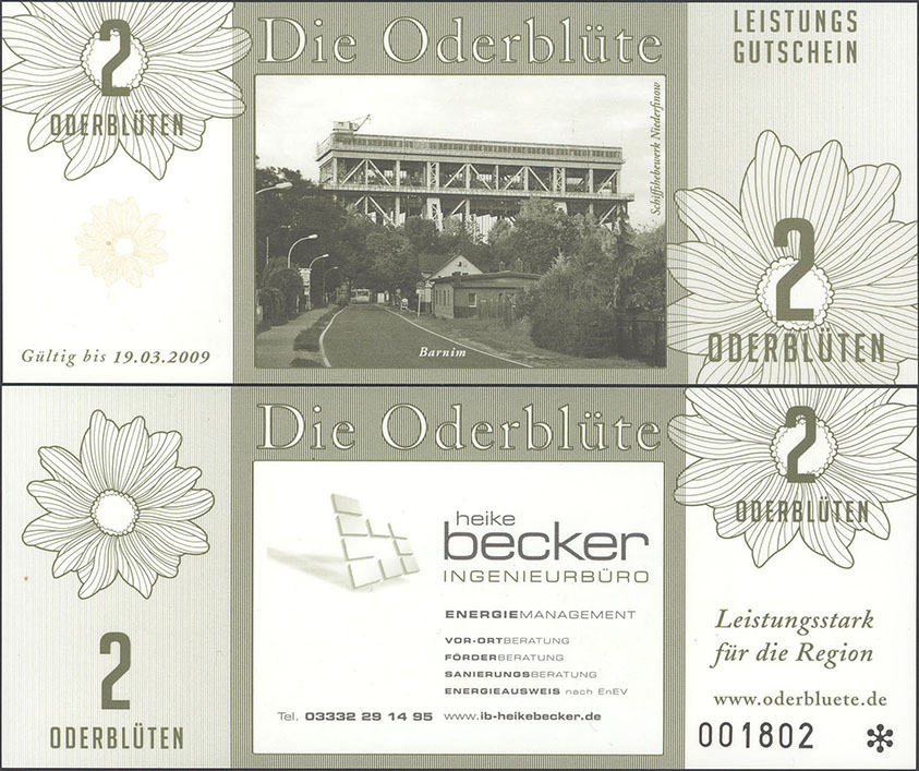 2 Oderblüten; erschienen 2008; Lange OD01.2; Vs.: Schiffshebewerk Finow, gültig bis19.3.2009; Rs.: WZ. 6-stellig und dahinter ein 6-zackiger Stern; ohne Wz.; Khakigrün; gedruckt auf Robuskin PE; Druckerei: Wippold, Schwedt |