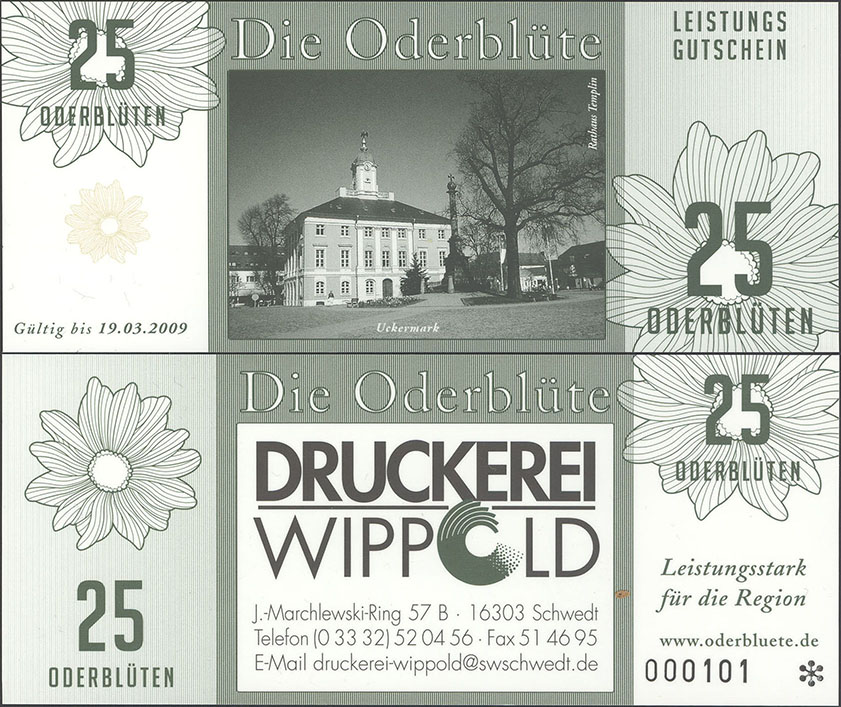 25 Oderblüten; erschienen 2008; Lange OD01.6; Vs.: Rathaus Templin, gültig bis19.3.2009; Rs.: WZ. 6-stellig und dahinter ein 6-zackiger Stern; ohne Wz.; Olivgrün; gedruckt auf Robuskin PE; Druckerei: Wippold, Schwedt |