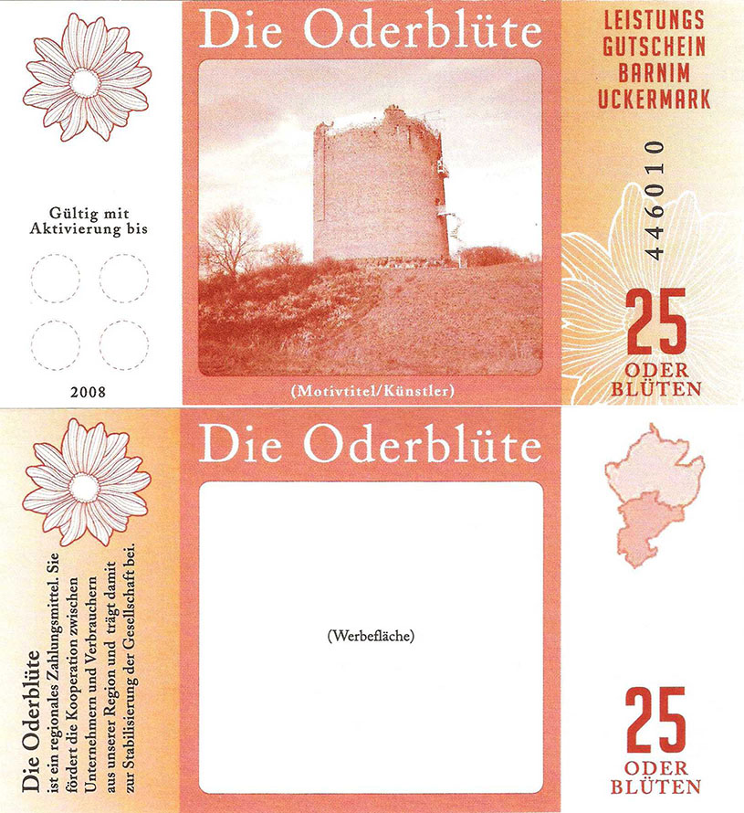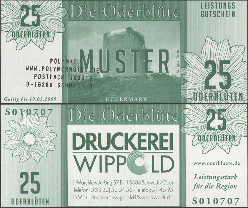 25 Oderblüten; erschienen 2008; nicht katalogisiert; Vs.: Stolper Turm, gültig mit Aktivierung bis 2008, WZ. 6-stellig; Rs.: Werbefläche; ohne Wz.; Orange; gedruckt auf Robuskin PE; Druckerei: Wippold, Schwedt |