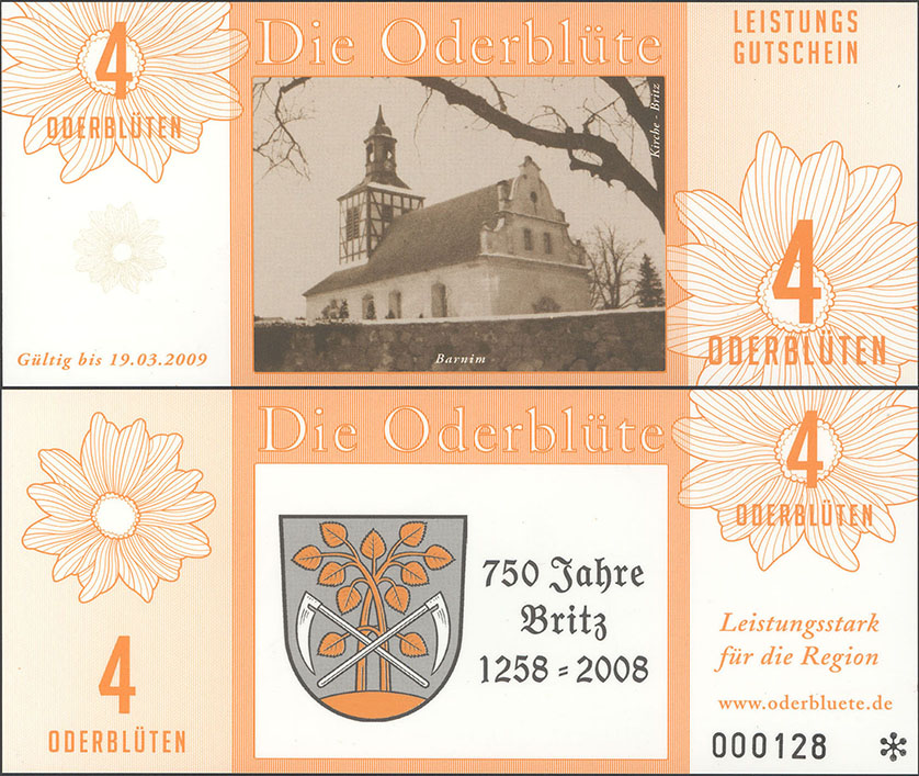 4 Oderblüten; erschienen 2008; nicht katalogisiert; Vs.: Kirche Britz, gültig bis19.3.2009; Rs.: WZ. 6-stellig und dahinter ein 6-zackiger Stern; ohne Wz.; Orange; gedruckt auf Robuskin PE; Druckerei: Wippold, Schwedt; Auflage: 400 Stück; Entwurf: Thomas Krause; Ausgegeben 15 Stück |