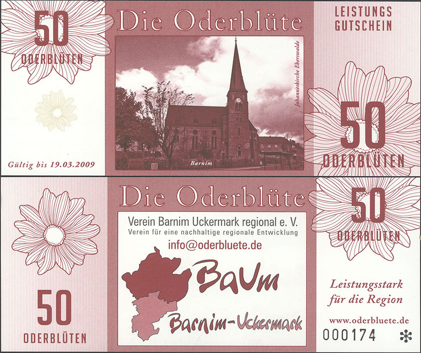 50 Oderblüten; erschienen 2008; Lange OD01.7; Vs.: Johanniskirche Eberswalde, gültig bis19.3.2009; Rs.: WZ. 6-stellig und dahinter ein 6-zackiger Stern; ohne Wz.; Rotbraun; gedruckt auf Robuskin PE; Druckerei: Wippold, Schwedt |