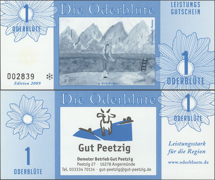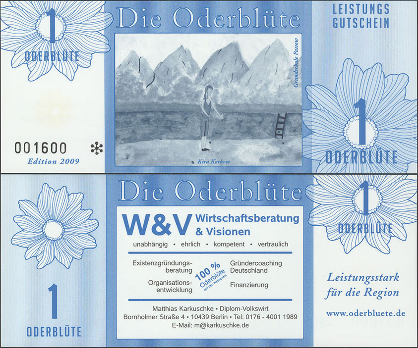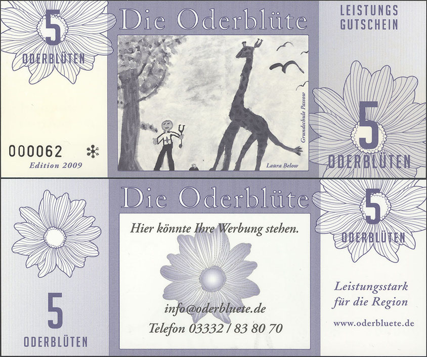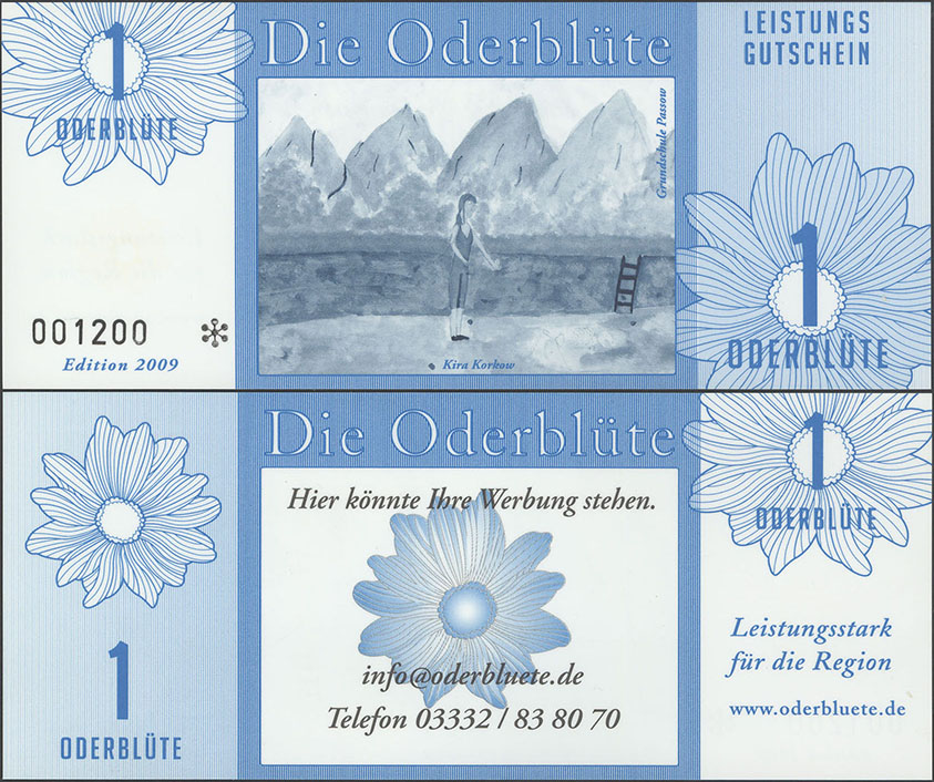 1 Oderblüte; erschienen 2009; Lange OD02.1; Vs.: Schülerzeichnung, Grundschule Passow; Rs.: WZ. 6-stellig und dahinter ein 6-zackiger Stern; ohne Wz.; Hellblau; gedruckt auf Robuskin PE; Druckerei: Wippold, Schwedt; Auflage: 500 Stück; Herausgeber: Wirtschaftsring Barnim-Uckermark; Graphik: Phillip Blöcker; Design: Thomas Krause |