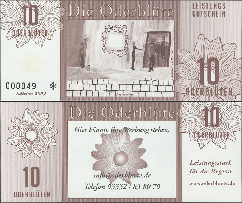 10 Oderblüten; erschienen 2009; Lange OD02.4; Vs.: Schülerzeichnung, Grundschule Passow; Rs.: WZ. 6-stellig und dahinter ein 6-zackiger Stern; ohne Wz.; Braun; gedruckt auf Robuskin PE; Druckerei: Wippold, Schwedt; Auflage: 300 Stück; Herausgeber: Wirtschaftsring Barnim-Uckermark; Graphik: Phillip Blöcker; Design: Thomas Krause |