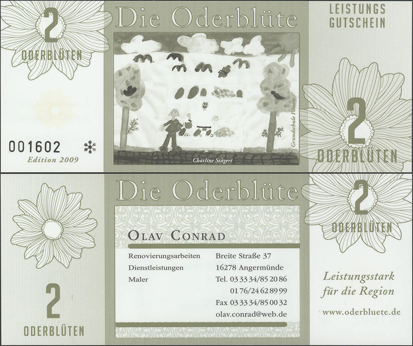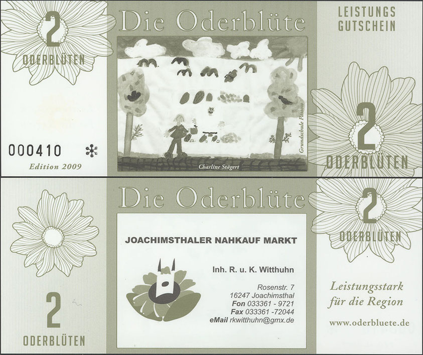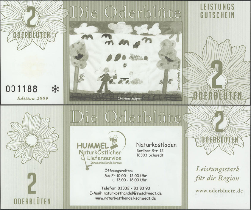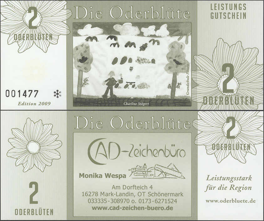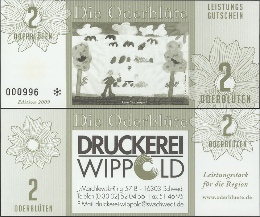 2 Oderblüten; erschienen 2009; Lange OD02.2; Vs.: Schülerzeichnung, Grundschule Passow; Rs.: WZ. 6-stellig und dahinter ein 6-zackiger Stern; ohne Wz.; Khakigrün; gedruckt auf Robuskin PE; Druckerei: Wippold, Schwedt; Auflage: 300 Stück; Herausgeber: Wirtschaftsring Barnim-Uckermark; Graphik: Phillip Blöcker; Design: Thomas Krause |