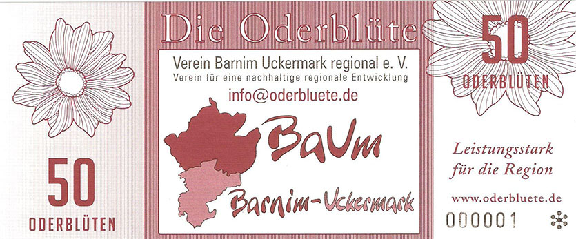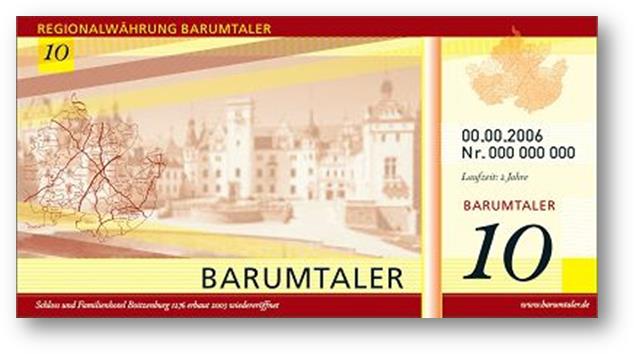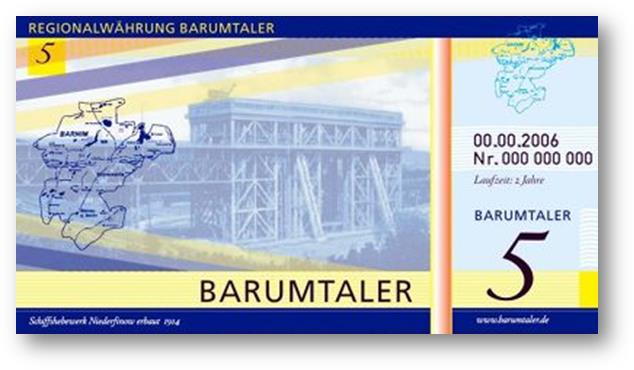 Ein eingereichter Vorschlag für das Aussehen des neuen Regionalgeldes. BARUMTALER, was für Barnim und Uckermark stehen soll. Man sah jetzt schon welche Ausmaße man sich als Ziel steckte. Regionalgeld für zwei Landkreise gleichzeitig, es gab viel zu tun. |