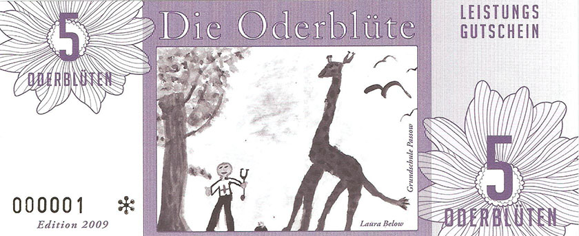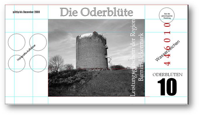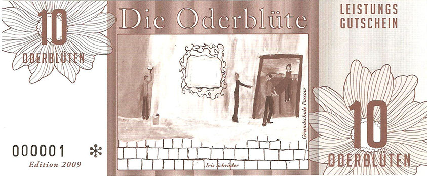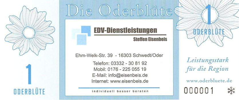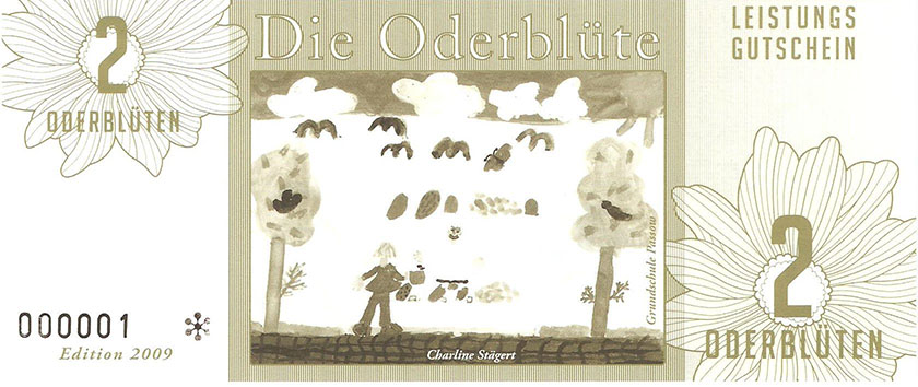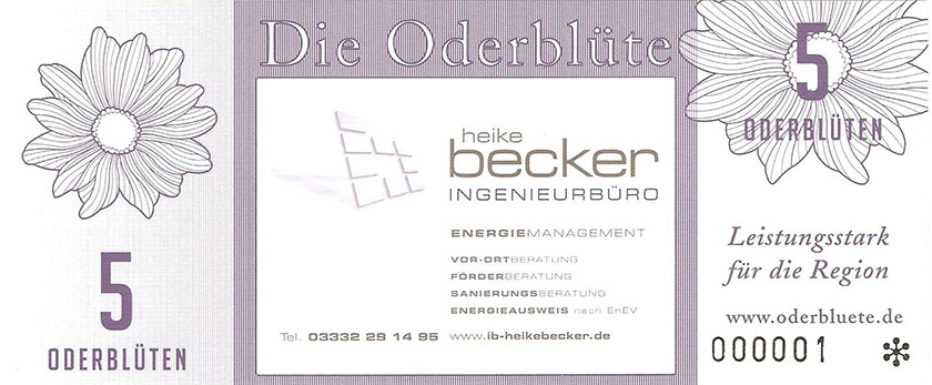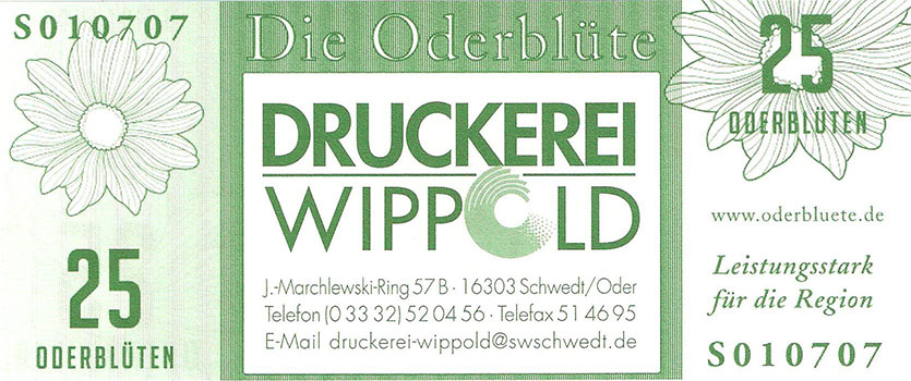 Ein weiterer Entwurf der zu sehen war. Hier nannte man es ODERBLÜTE, mit dessen Namen man sich in Schwedt und nähere Umgebung bestimmt identifizieren könnte. Bundesfreund Th. Krause interessierte sich besonders für diesen Ausstellungsteil. Er sagte prompt zur Ausstellerin, Heike Becker „….warum man so ein Spielgeld herstellen möchte….“ Eine kurze Ausführung seitens der Ausstellerin gab uns ausreichend Informationen. Weiterhin meinte Bundesfreund Th. Krause, er könnte das besser und sicherer gestalten, so trat er in den Verein Wirtschaftsring Barnim-Uckermark e.G.i.G. bei, um den Mitgliedern bei der Gestaltung der Gutscheine behilflich zu sein. Nach mehreren Sitzungen im neuen Verein, wurde dann über das Design der neuen Gutscheine beraten. Erklärt wurde, das man kleine Werte nehmen solle und vielleicht Größe und Farben, derer Geldscheine der ehemaligen DDR. Somit hätte man hier wahrscheinlich eine Change und gewissen Wiedererkennungswert, um mit neuem Geld zu Punkten. Aber die Ziele des Vereines waren andere: 1. das Geld sollte in der Uckermark und gleichzeitig im Barnim umlaufen 2. man wolle Nominale von 1-100 ausgeben 3. es solle eine Parität von 1:2 haben Bundesfreund Th. Krause kümmerte sich nicht weiter um die ideologischen Dinge des Vereines und fuhr nach Berlin in ein Grafikstudio zu Phillip Blöcker. Dort ließ er am Computer seine Ideen grafisch umsetzen, weil im persönlich dazu die Möglichkeiten fehlten. Das Endprodukt brachte er mit nach Schwedt und man war begeistert. So wurden einige Sicherheitsmerkmale in das Design integriert, denn Banknoten bzw. Gutscheine benötigen eine gewisse Fälschungssicherheit. So entstand eine Kleinserie Gutscheine namens ODERBLÜTE. In der Schwedter Druckerei Andreas Wippold wurden letzte Vorbereitungen getroffen. Man einigte sich auf das polymerisch reißfeste Material Robuskin. Robuskin PE vereint die Bedruckbarkeit eines gestrichenen Papieres mit den physikalischen Vorteilen einer Kunststoff-Folie und kann überall dort eingesetzt werden, wo Druckwerke extremen Belastungen standhalten müssen. Robuskin PE überzeugt durch hohe Ein- und Weiterreißfestigkeit und durch besondere Stabilität, Witterungs- und Temperatur-beständigkeit (-30°C bis +60°C). Außerdem ist es gegen Wasser, Speichel, Schweiß, sowie Fett und verschiedene Chemikalien beständig. Robuskin PE wird ohne giftige Inhaltsstoffe erzeugt und ist recycelbar. Robuskin PE eignet sich für Werbedrucksachen im Außenbereich, Poster/Plakate, Speisekarten, Eintritts- und Identitätskarten, Stadtpläne, Land- und Seekarten, Wartungsanleitungen, Etiketten aller Art, hochwertige Verpackungen und für viele andere Anwendungen. |