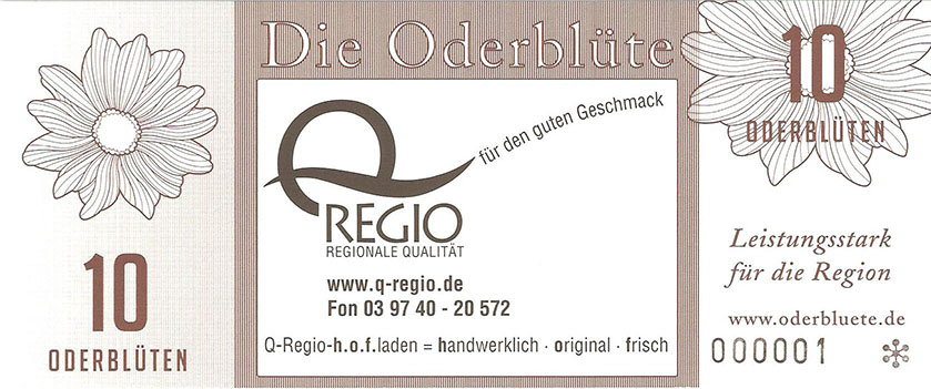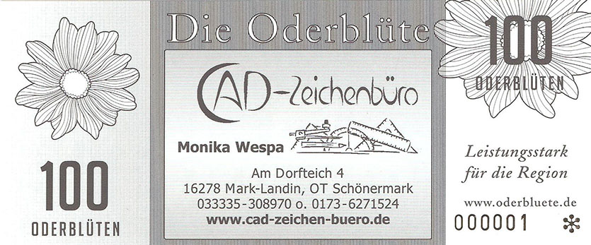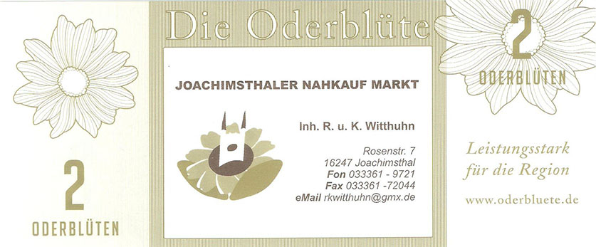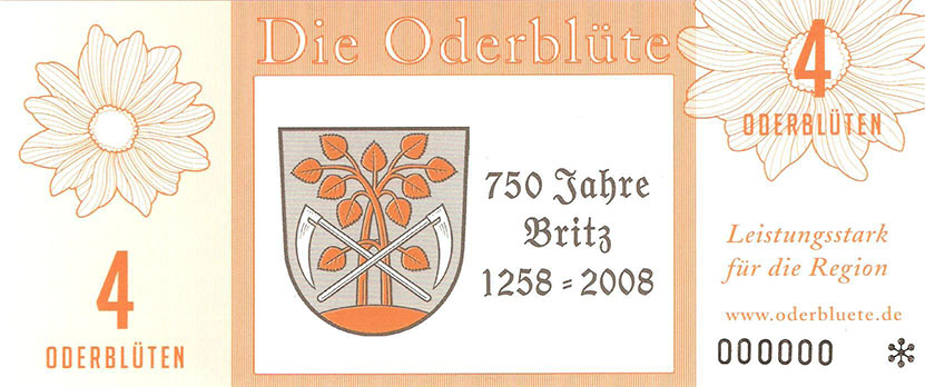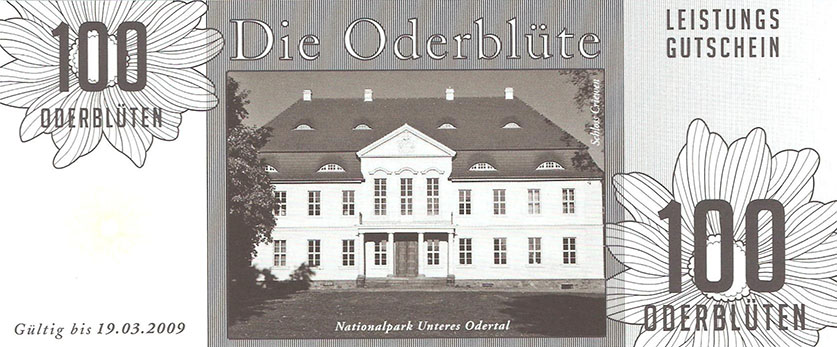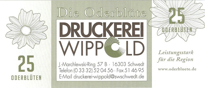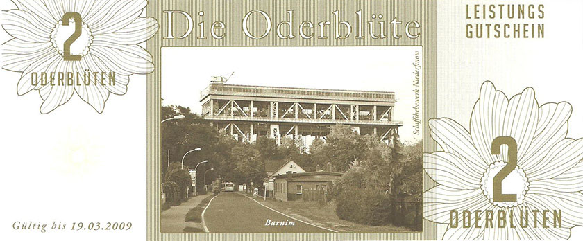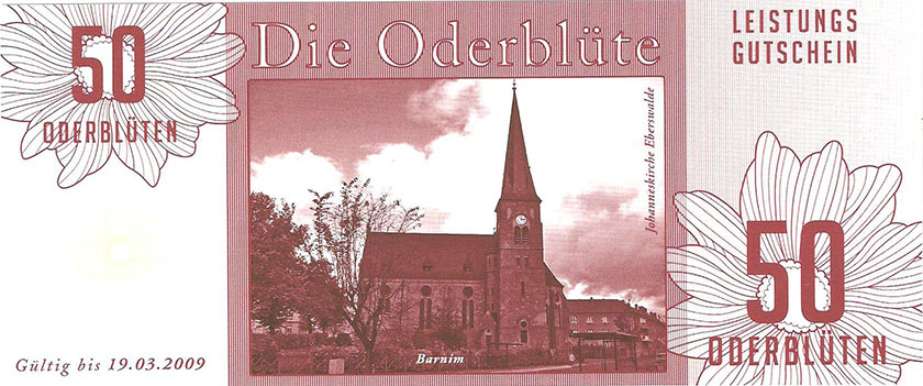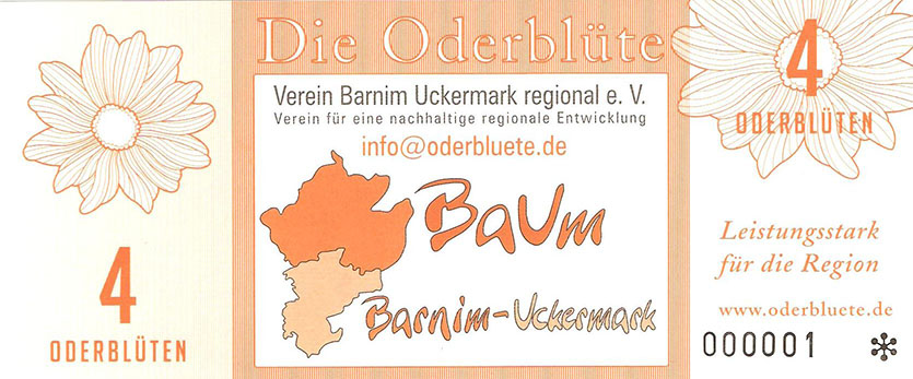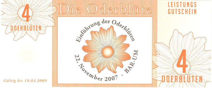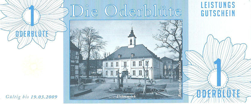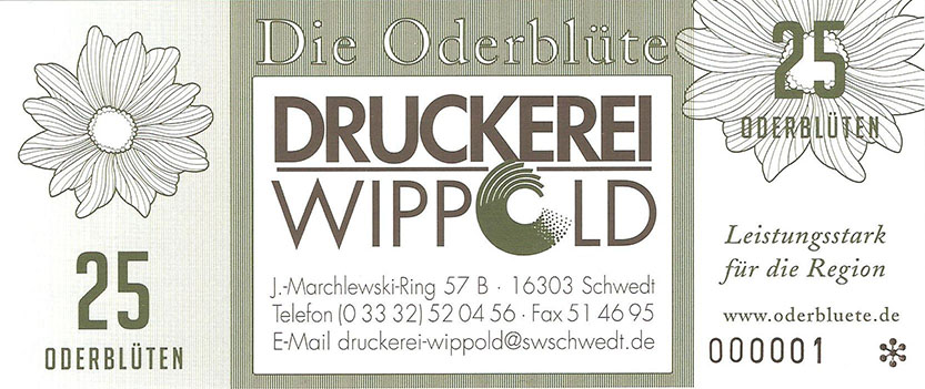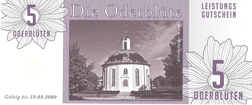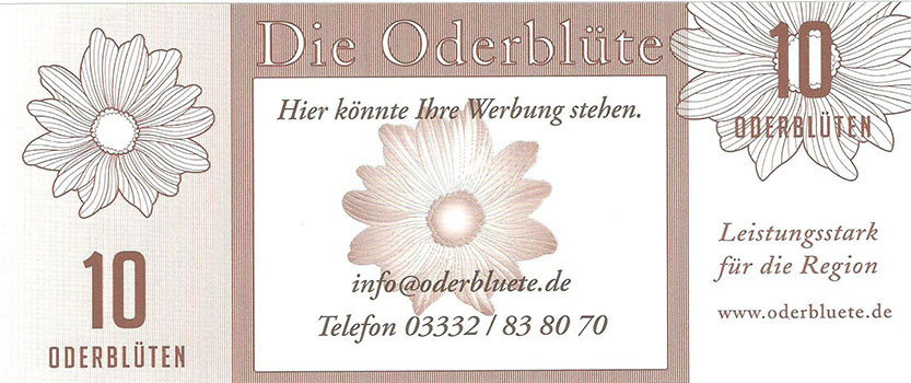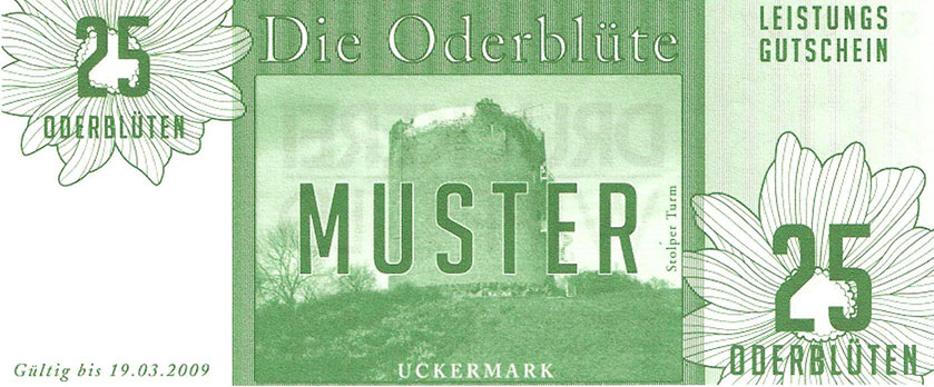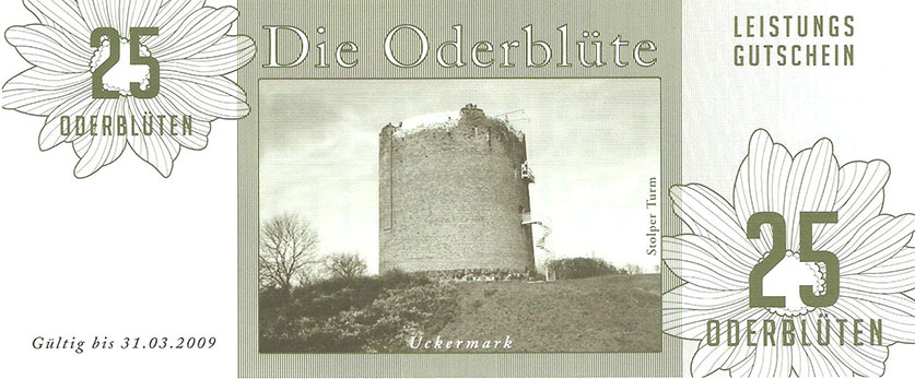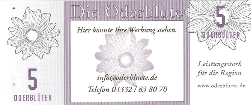 So wurde ein Gutschein zu 25 Oderblüten, als Probedruck, mit dem Abbild des Stolper Turmes mit allen Durchgängen hergestellt und präsentierte ihn dem Verein Wirtschaftsring Barnim-Uckermark e.G.i.G. Nach der Begutachtung hat man sich für den Komplettdruck entschieden. Was nun noch zu klären war, war die Tatsache, welches Nominal welche Grundfarbe haben sollte und welche Motive auf den Gutscheinen zu sehen sein sollte. Die Farben regelten sich nach den Vorlagen der DDR-Mark und die Motive wurden anhand von mehreren Fotos ausgewählt. So bekamen die Gutscheine Farbe und Motiv wie folgt: 1 Oderblüte – Hellbrau – Rathaus Angermünde (Uckermark) 2 Oderblüten – Khakigrün – Schiffshebewerk Finow (Barnim) 4 Oderblüten – Orange – Adomisrose, wurde für Sonderausgaben benutzt 5 Oderblüten – Lila – Berlischky Pavillon ( Uckermark) 10 Oderblüten – Braun – Kloster Chorin (Barnim) 25 Oderblüten – Olivgrün - Rathaus Templin (Uckermark) 50 Oderblüten – Rotbraun – Johanniskirche Eberswalde (Barnim) 100 Oderblüten – Graublau – Schloss Criewen – (Uckermark) Anhand dieser Liste, war schon deutlich dieses Projekt zum Scheitern verurteilt. Warum muss man solche Hohe Werte ausgeben? Sollte man nicht erstmal Klein anfangen ? Und was soll hier eine Parität? Zum anderem war noch die Tatsache zu beklagen, das sehr wenig Pressearbeit geführt wurde, sodass die Bürger nur durch Mundpropaganda davon erfuhren und genau da wurde vieles falsch erklärt und weitergegeben. Man konnte die wenigen interessierten Bürger auch nicht davon überzeugen, bzw. es ihnen glaubhaft erklären. Es kamen noch kleinere Streitereien in den Reihen des Vereins hinzu, sodas dieses Projekt später beendet wurde, ohne richtig gestartet zu sein. Bundesfreund Th. Krause konnte im Namen des Vereines sein Wissen und Können in der ODERBLÜTE einfließen lassen und bedauert, dass die Adonisrose verblüte. |