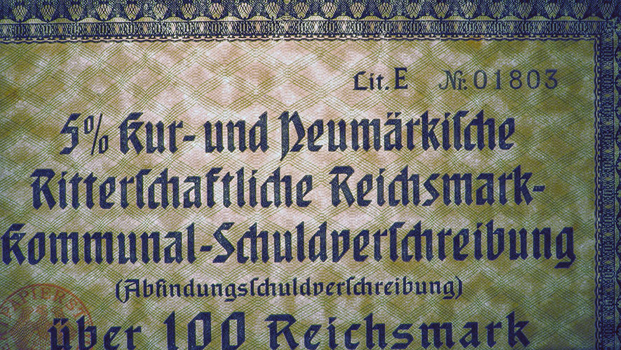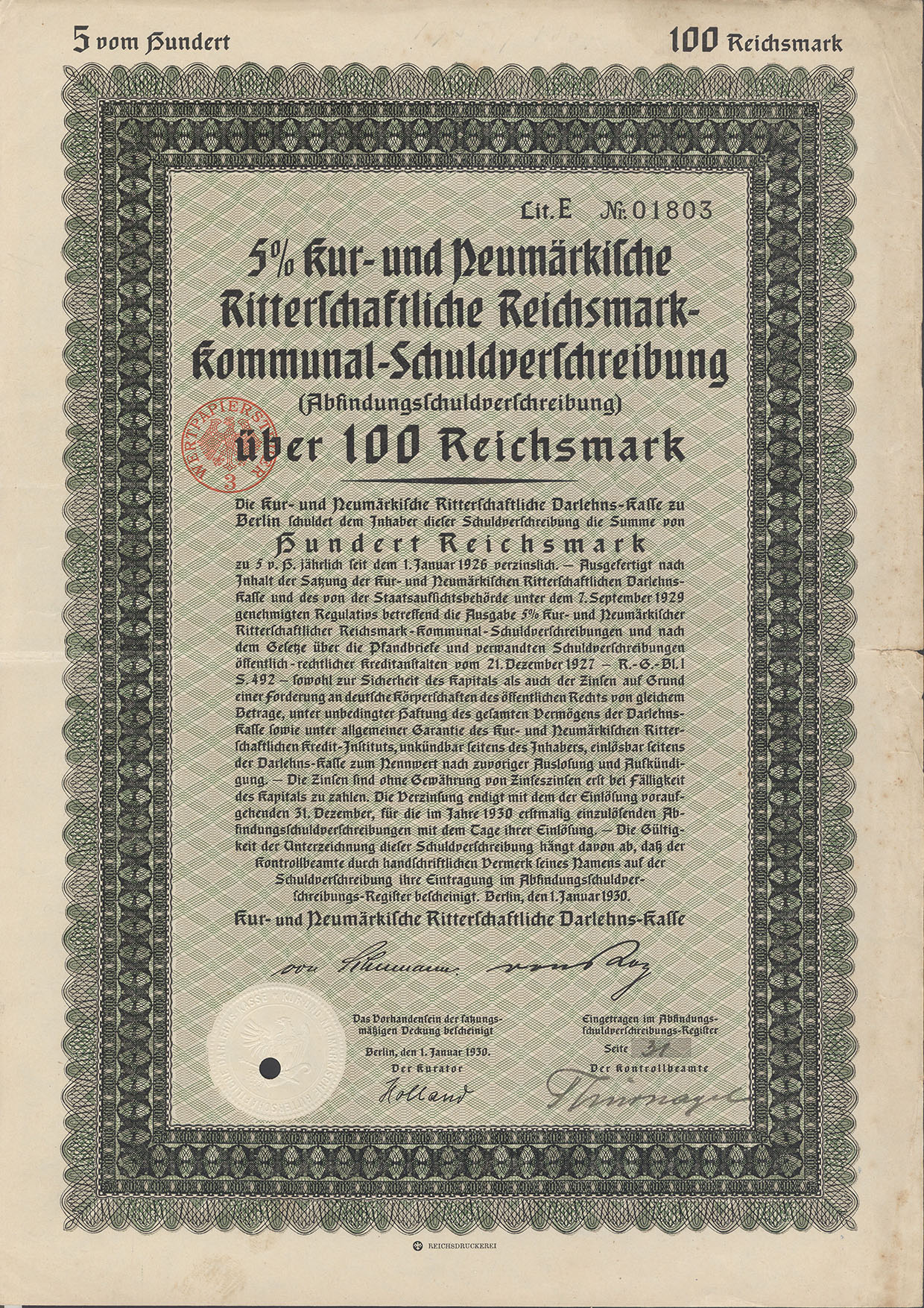 100 Reichsmark; Kur- und Neumärkische Ritterschaftliche 5% Reichsmark-Kommunal-Schuldverschreibung; ausgestellt in Berlin, am 1. Januar 1930; nicht katalogisiert; Wz.: Kreuzblumenmuster; Lochentwertet; Drfa.: Reichsdruckerei |