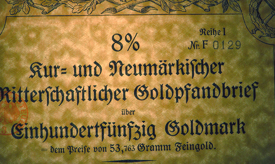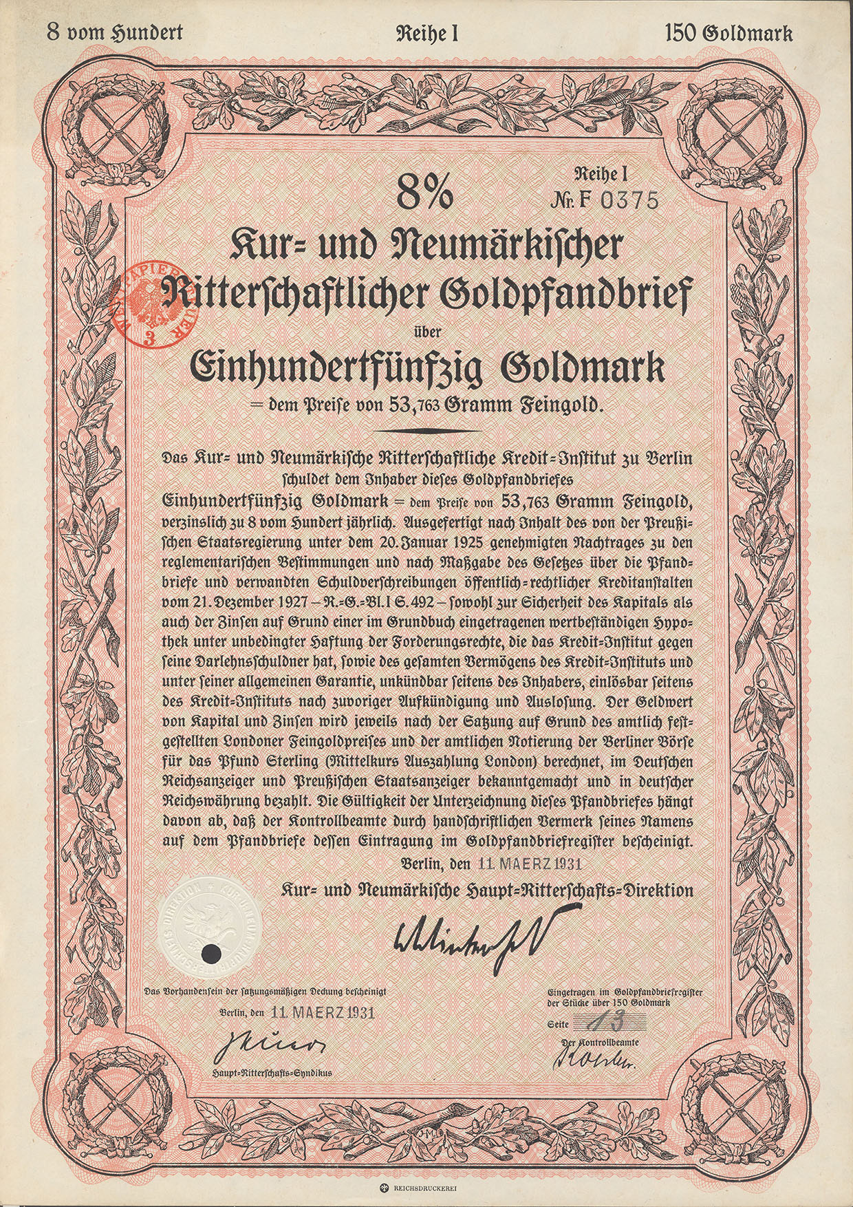 150 Goldmark; 8% Goldpfandbrief; Kur- und Neumärkische Ritterschaftliches Kredit-Institut; ausgestellt in Berlin, am 11. März 1931; nicht katalogisiert; Wz.: Kreuzblumenmuster; Lochentwertet; Drfa.: Reichsdruckerei |