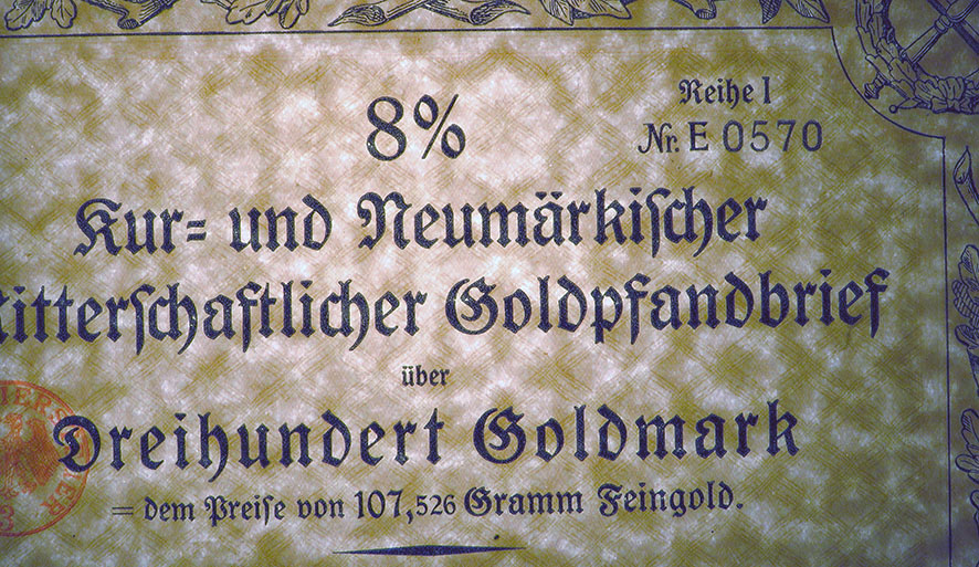 300 Goldmark; 8% Goldpfandbrief; Kur- und Neumärkische Ritterschaftliches Kredit-Institut; ausgestellt in Berlin, am 1927; nicht katalogisiert; Wz.: Kreuzblumenmuster; Lochentwertet; Drfa.: Reichsdruckerei |