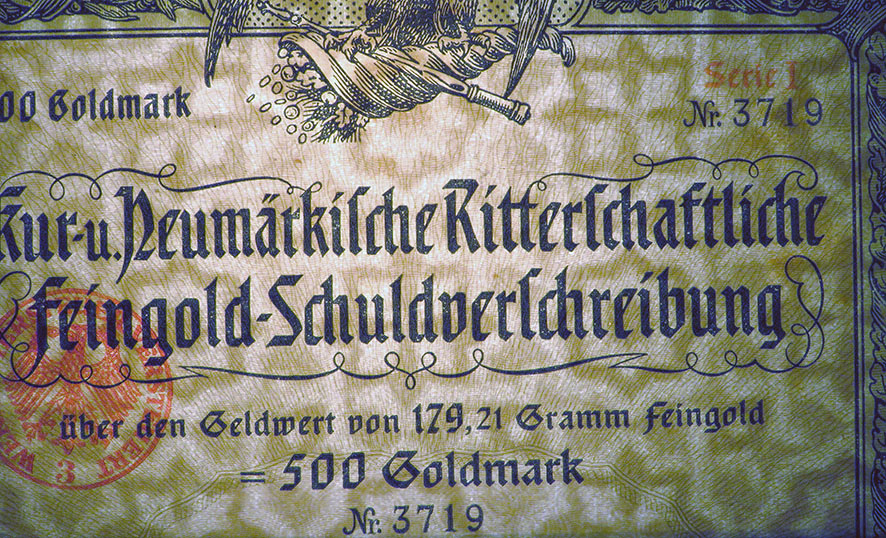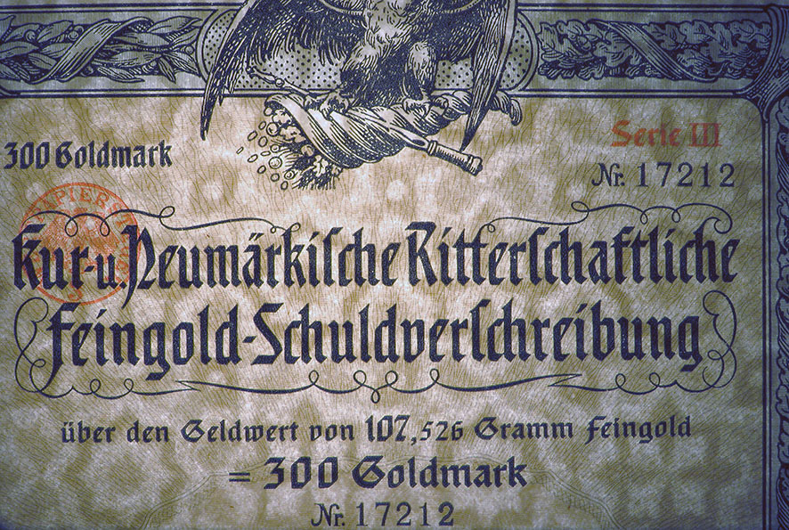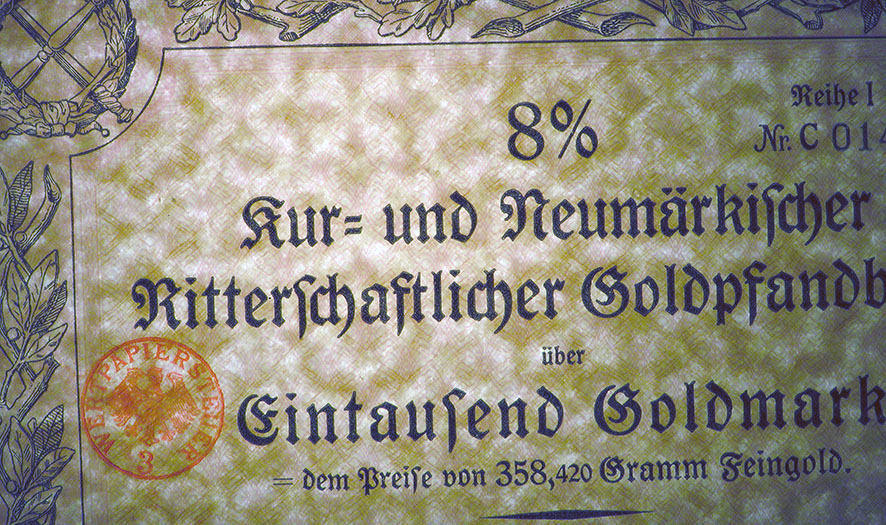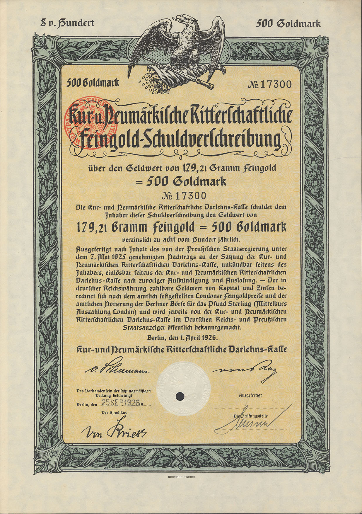 500 Goldmark; Kur- und Neumärkische Ritterschaftliche 8% Feingold-Schuldverschreibung; ausgestellt in Berlin, am 1. April 1926; nicht katalogisiert; Wz.: Kreuzblumenmuster; Lochentwertet; Drfa.: Reichsdruckerei |