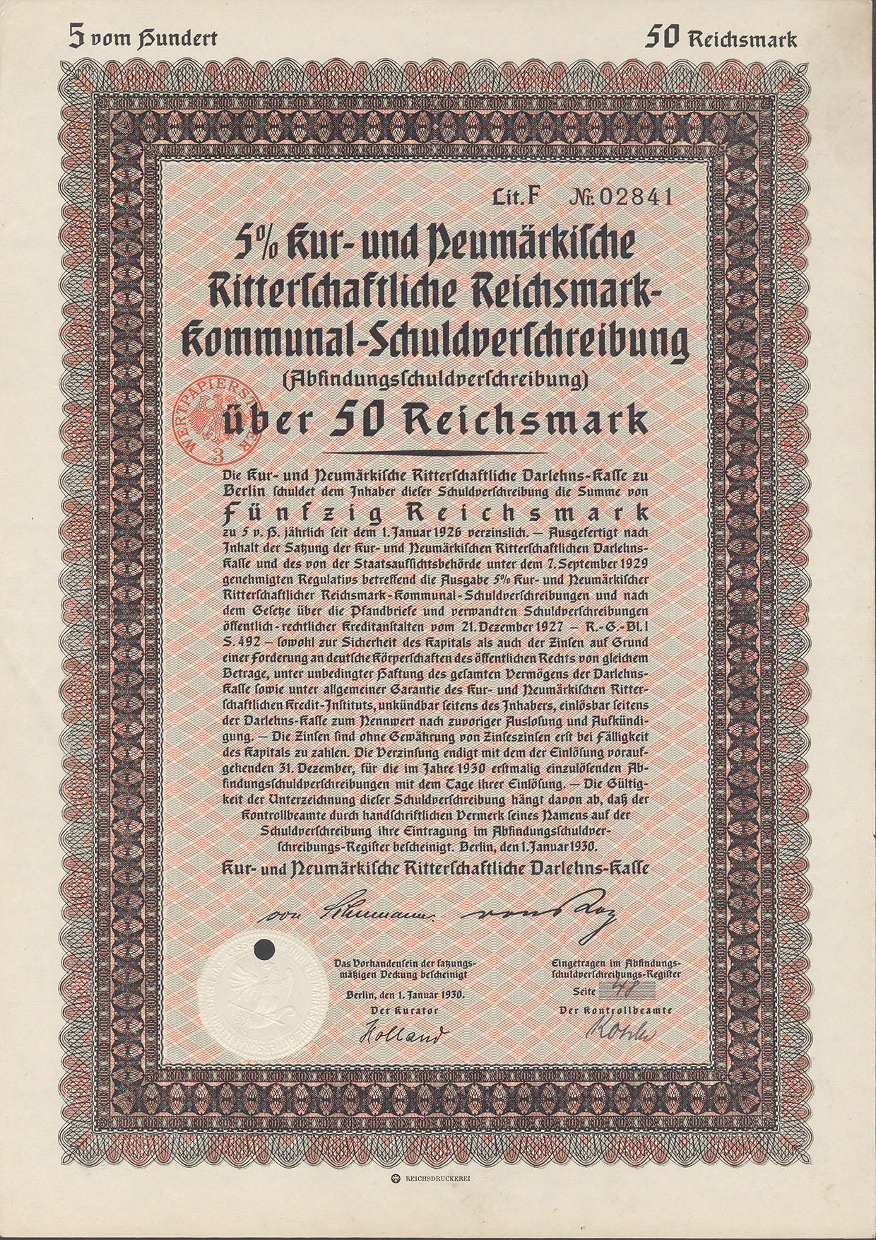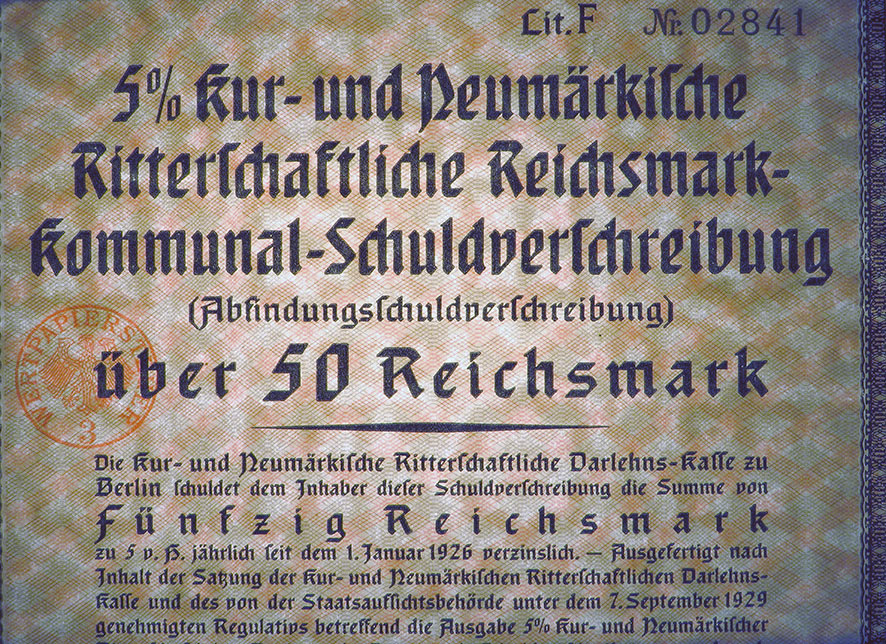 50 Reichsmark; Kur- und Neumärkische Ritterschaftliche 5% Reichsmark-Kommunal-Schuldverschreibung; ausgestellt in Berlin, am 1. Januar 1930; nicht katalogisiert; Wz.: Kreuzblumenmuster; Lochentwertet; Drfa.: Reichsdruckerei |