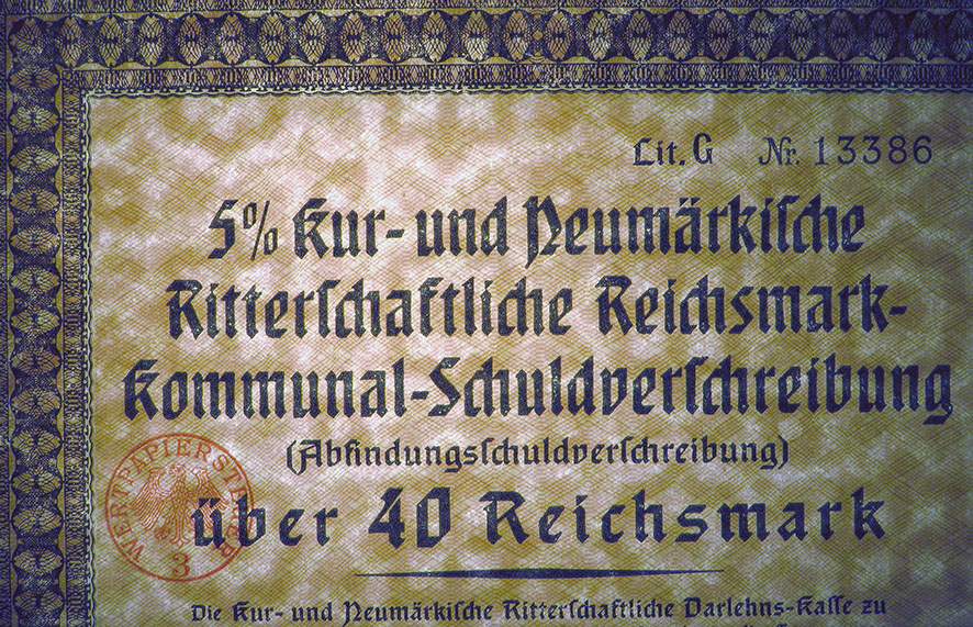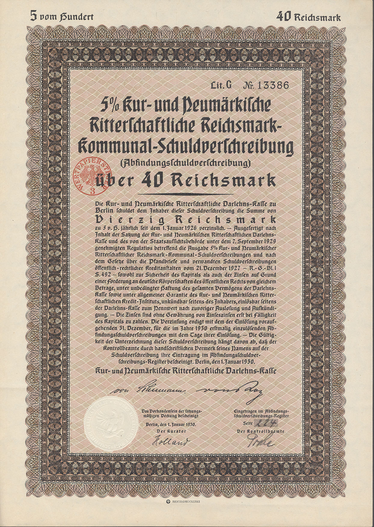 40 Reichsmark; Kur- und Neumärkische Ritterschaftliche 5% Reichsmark-Kommunal-Schuldverschreibung; ausgestellt in Berlin, am 1. Januar 1930; nicht katalogisiert; Wz.: Kreuzblumenmuster; nicht lochentwertet; Drfa.: Reichsdruckerei |