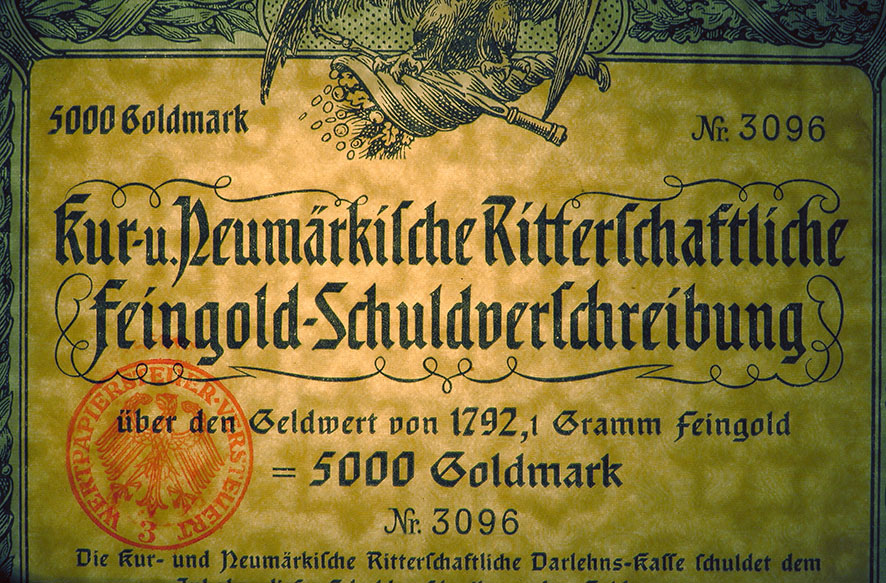 5000 Goldmark; Kur- und Neumärkische Ritterschaftliche 8% Feingold-Schuldverschreibung; ausgestellt in Berlin, am 1. April 1926; nicht katalogisiert; Wz.: Kreuzblumenmuster; Lochentwertet; Drfa.: Reichsdruckerei |