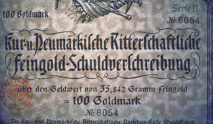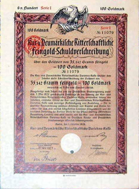 100 Goldmark; Serie I; Kur- und Neumärkische Ritterschaftliche 6% Feingold-Schuldverschreibung; ausgestellt in Berlin, am 1. Oktober 1926; nicht katalogisiert; Wz.: Kreuzblumenmuster; Lochentwertet; Drfa.: Reichsdruckerei |