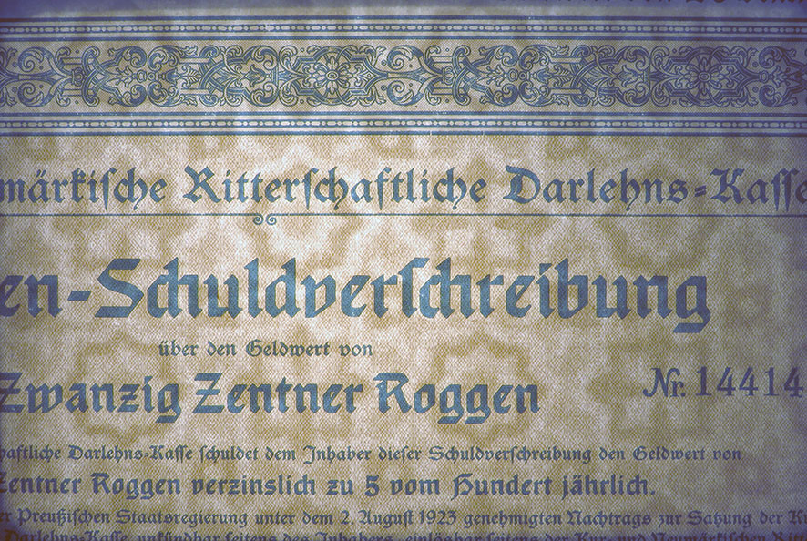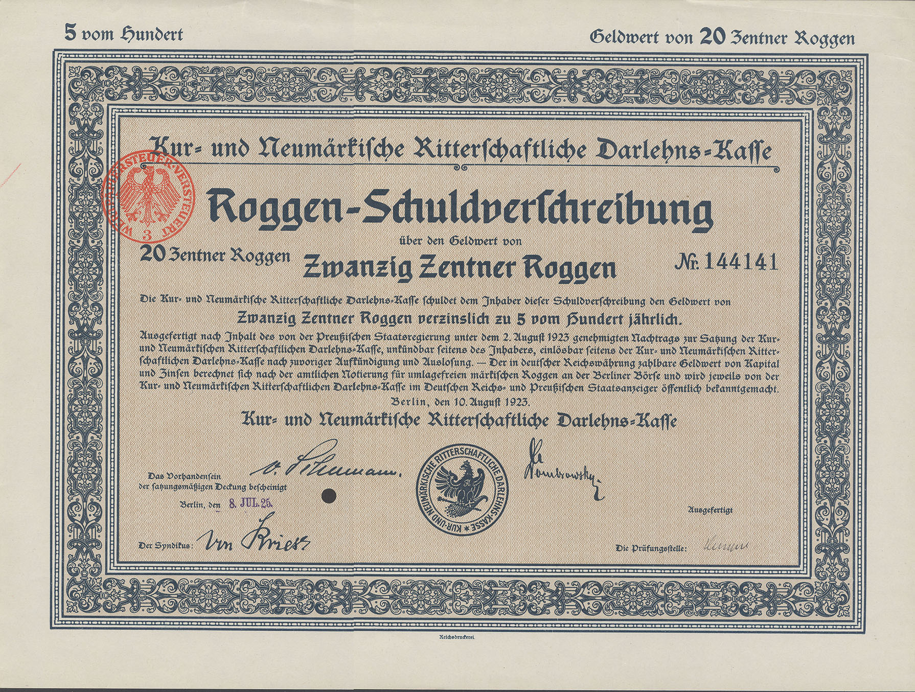 20 Zentner Roggen; 5% Roggen-Schuldverschreibung; ausgestellt in Berlin, am 10. August 1923; nicht katalogisiert; Wz.: Kreuzblumenmuster; Lochentwertet; Drfa.: Reichsdruckerei |