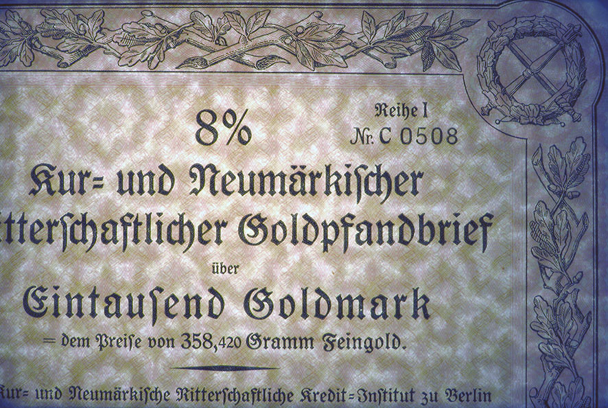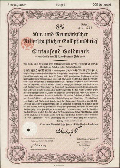 1.000 Goldmark; 8% Goldpfandbrief; Kur- und Neumärkische Ritterschaftliches Kredit-Institut; ausgestellt in Berlin, am 1930; nicht katalogisiert; Wz.; Lochentwertet; Drfa.: Reichsdruckerei |