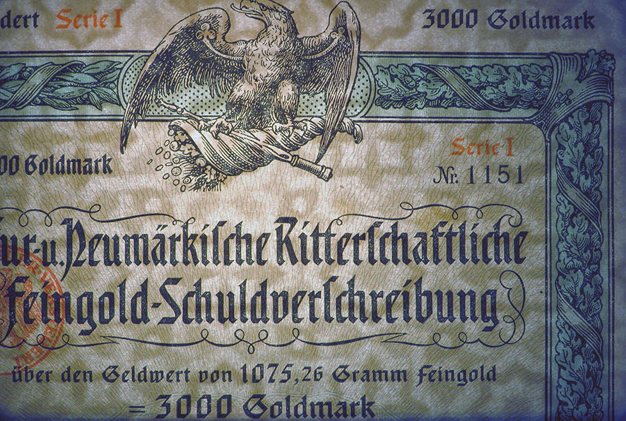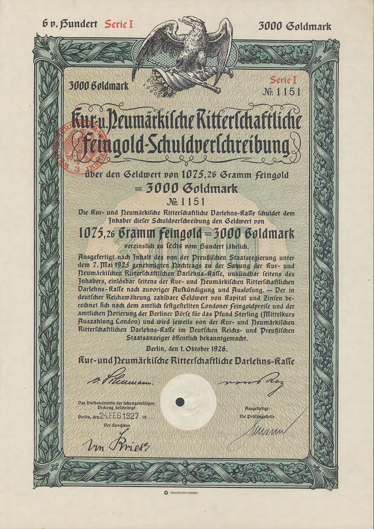3000 Goldmark; Kur- und Neumärkische Ritterschaftliche 6% Feingold-Schuldverschreibung; ausgestellt in Berlin, am 1. Oktober 1926; nicht katalogisiert; Lochentwertet; Drfa.: Reichsdruckerei |