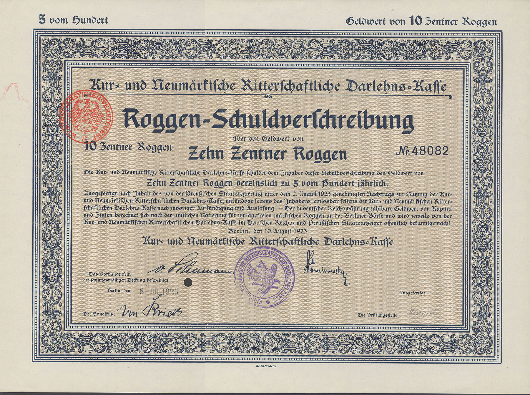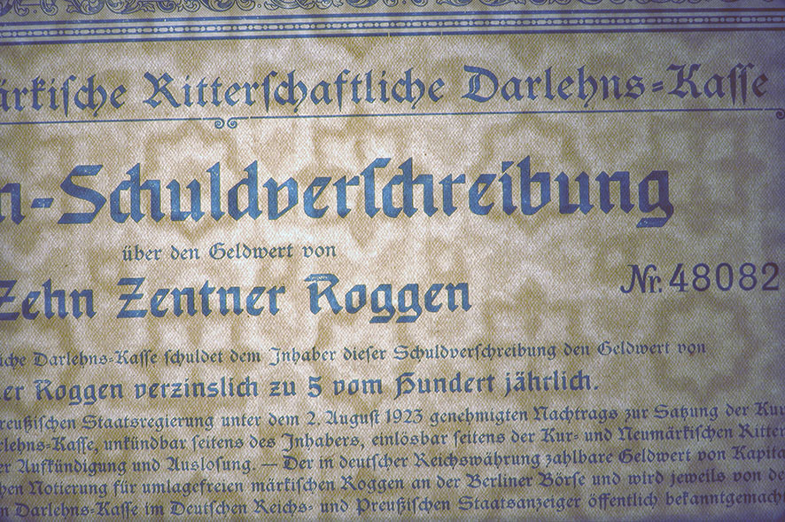 10 Zentner Roggen; 5% Roggen-Schuldverschreibung; ausgestellt in Berlin, am 10. August 1923; nicht katalogisiert; Wz.: Kreuzblumenmuster; Lochentwertet; Drfa.: Reichsdruckerei |