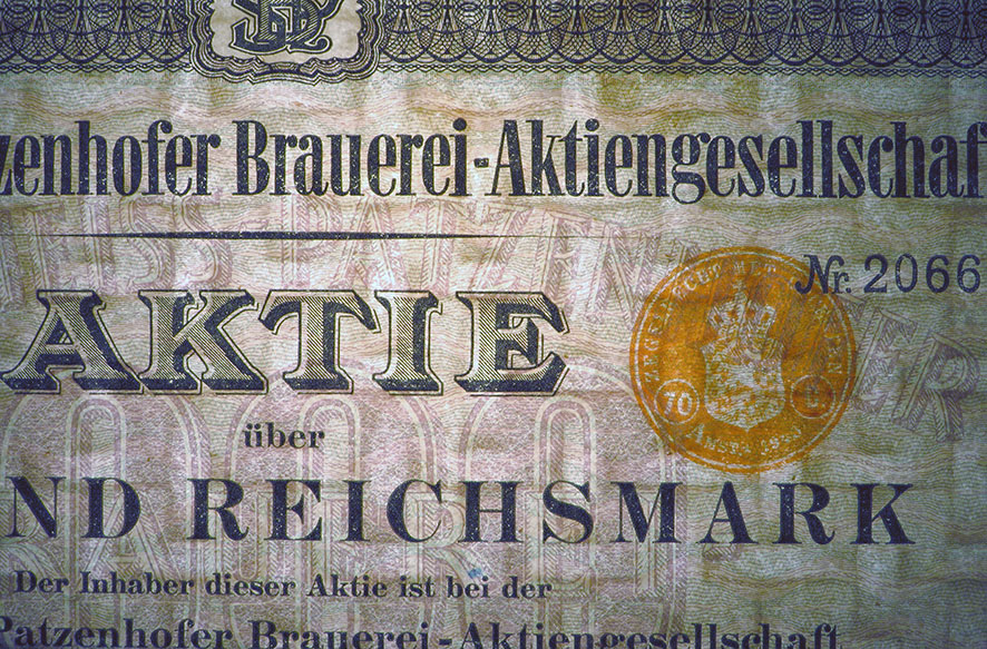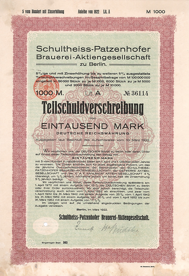 1.000 Mark; Schultheiss-Patzenhofer Brauerei-AG; 5% Teilschuldverschreibung; ausgestellt in Berlin, im März 1922; nicht katalogisiert; Wz.: ; Drfa.: |