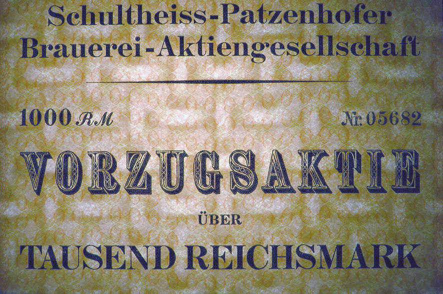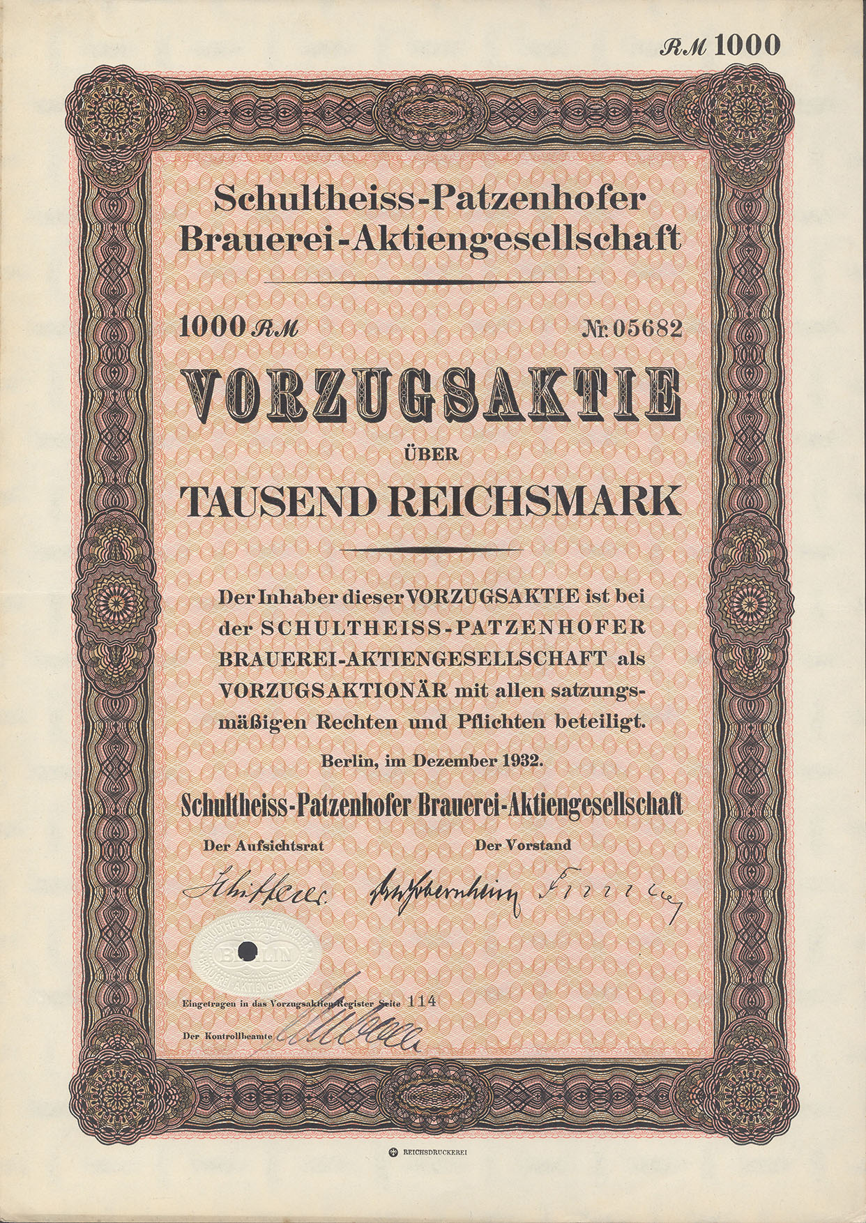 1.000 Reichsmark; Schultheiss-Patzenhofer Brauerei-AG; ausgestellt in Berlin, im Dezember 1932; SUPPES 2005/06-15418; Vorzugsaktie Wz.: verflochtene Wellenbänder; Drfa.: Reichsdruckerei; lochentwertet |