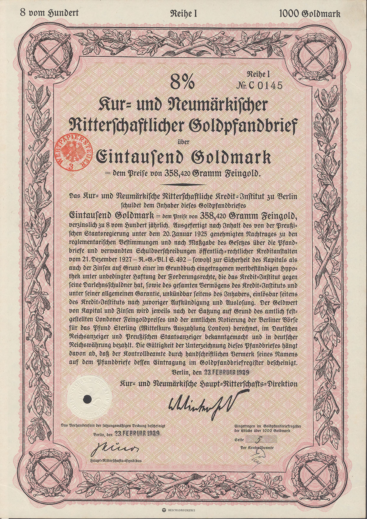 1.000 Goldmark; 8% Goldpfandbrief; Kur- und Neumärkische Ritterschaftliches Kredit-Institut; Ausgestellt in Berlin, am 23. Februar 1929; nicht katalogisiert; Wz.: Kreuzblumenmuster; Lochentwertet; Drfa.: Reichsdruckerei |