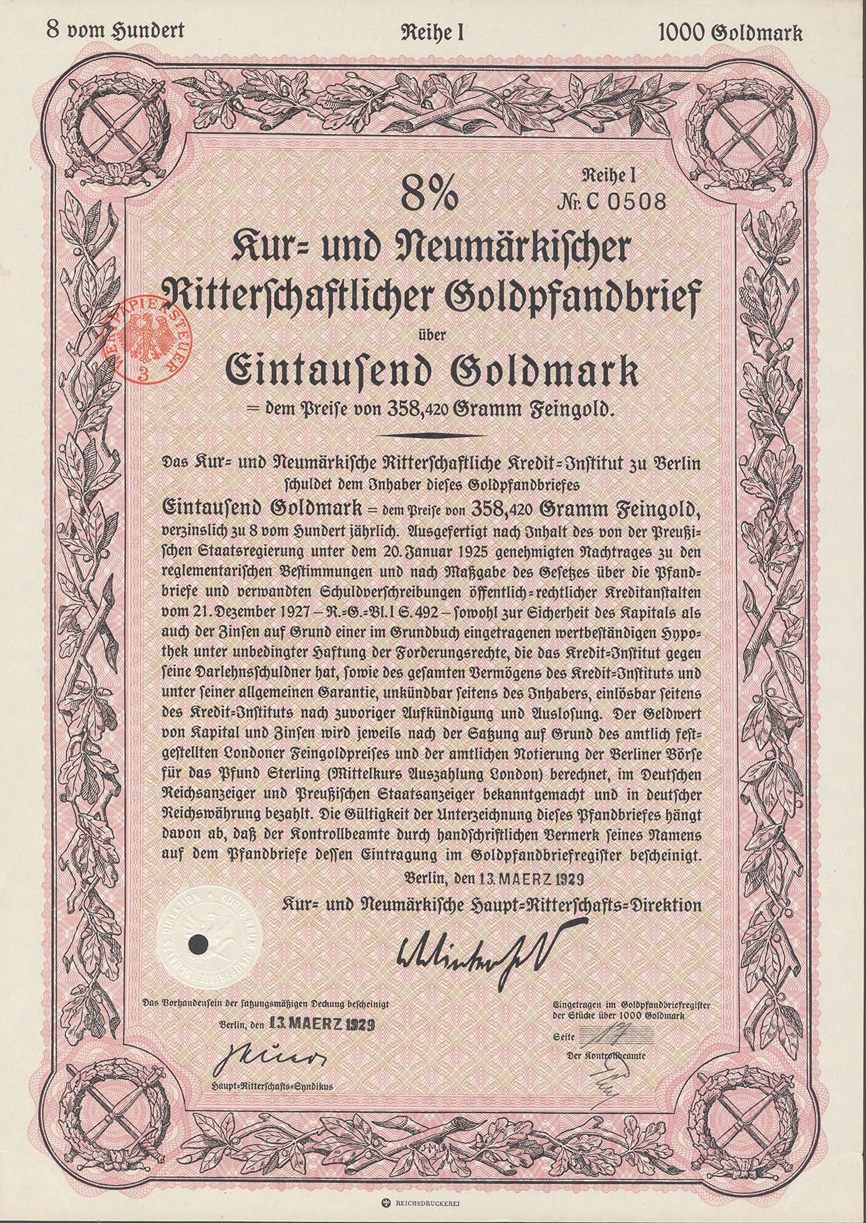 1.000 Goldmark; 8% Goldpfandbrief; Kur- und Neumärkische Ritterschaftliches Kredit-Institut; Ausgestellt in Berlin, am 13. März 1929; nicht katalogisiert; Wz.: Kreuzblumenmuster; Lochentwertet; Drfa.: Reichsdruckerei |