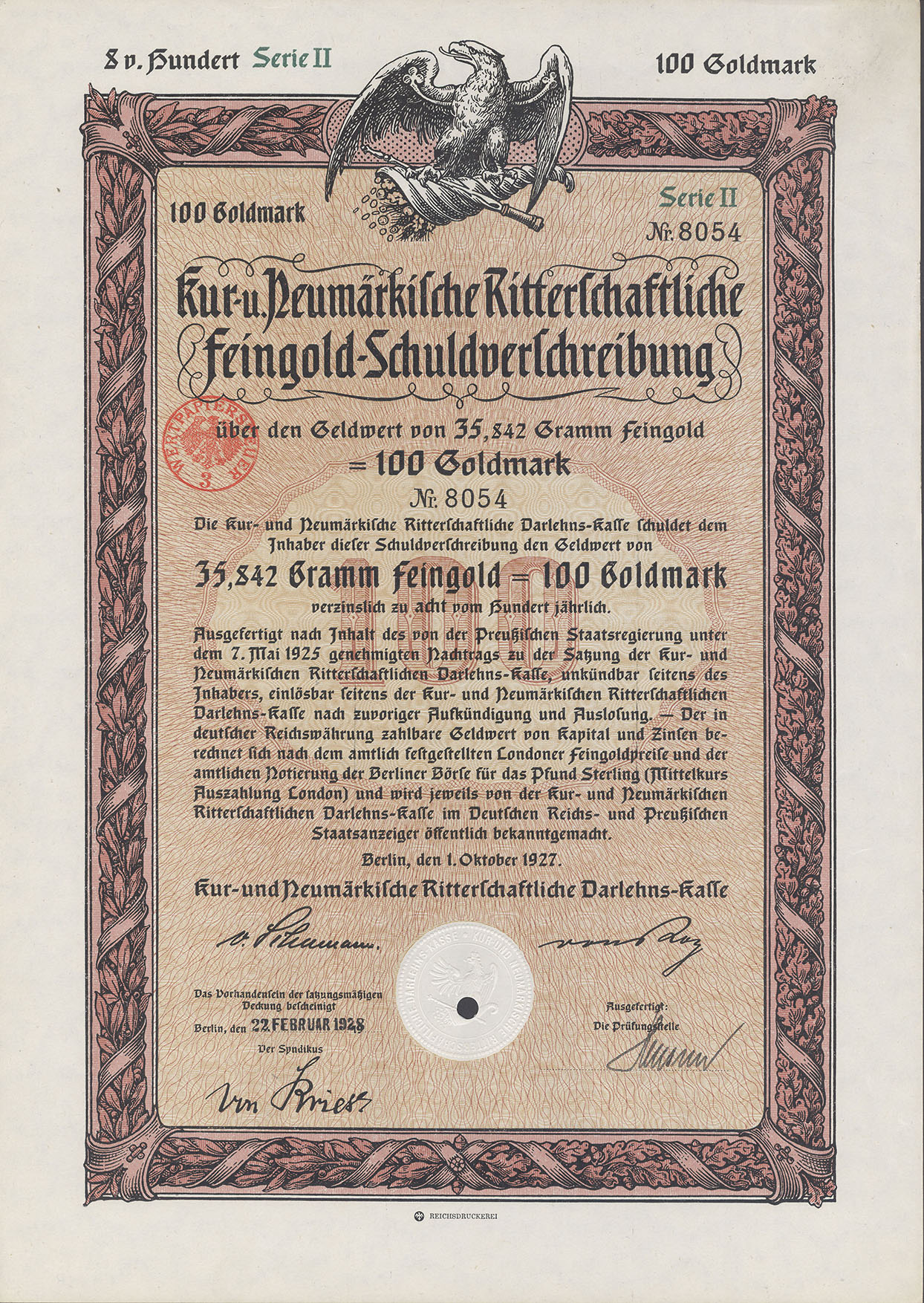 100 Goldmark; Serie II; Kur- und Neumärkische Ritterschaftliche 8% Feingold-Schuldverschreibung; ausgestellt in Berlin, am 1. Oktober 1927; nicht katalogisiert; Wz.: Kreuzblumenmuster; Lochentwertet; Drfa.: Reichsdruckerei |